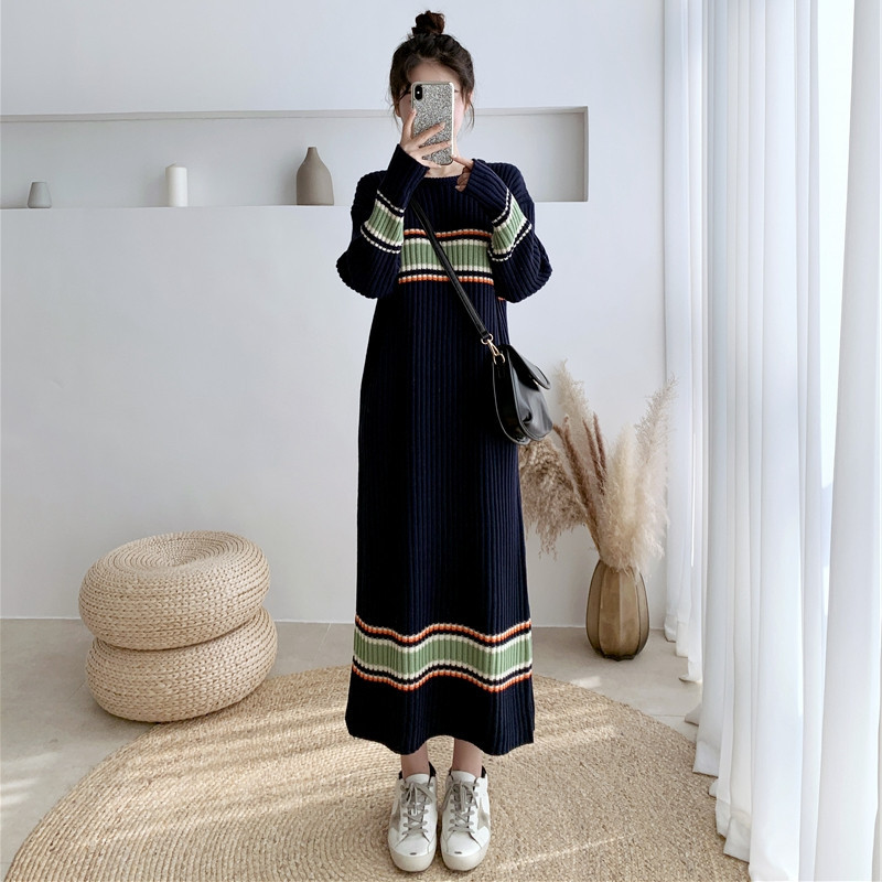 怠惰な風の丸首のストライプのセーターの長いスカートの女性の秋冬のタイプは厚くてゆったりしていて、着痩せしています。