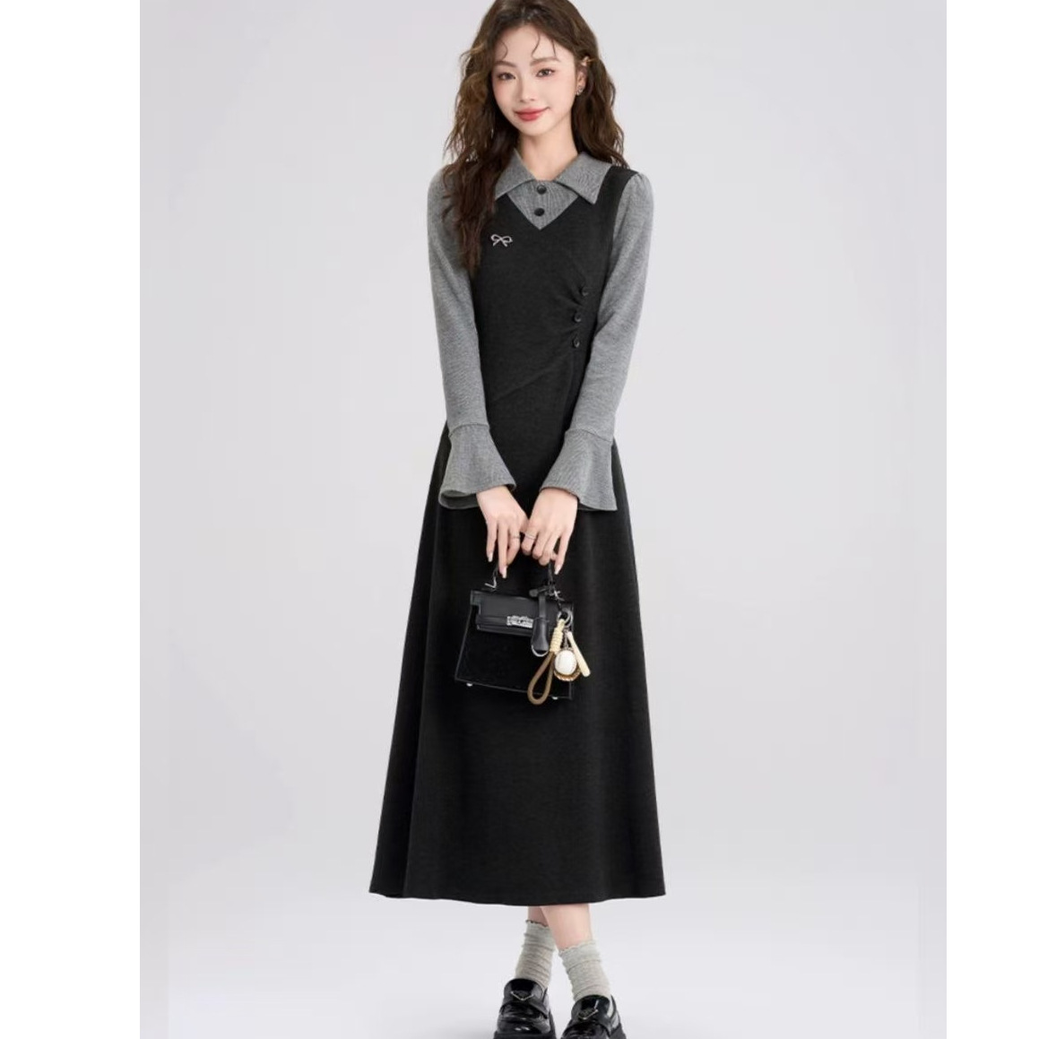 法式复古针织连衣裙感女秋冬季新款大码胖mm假两件黑色长裙子女装