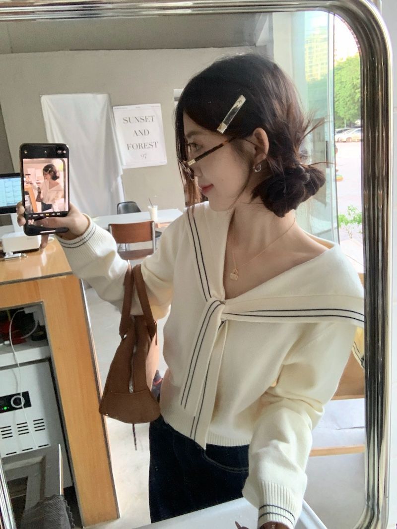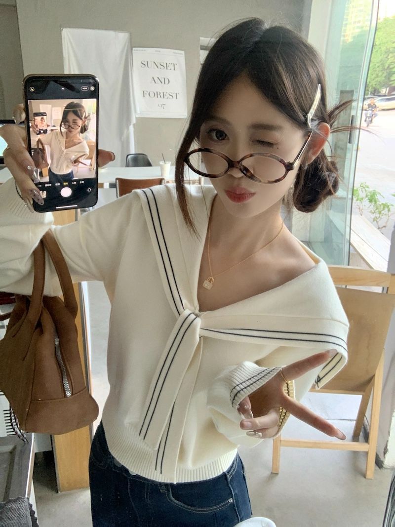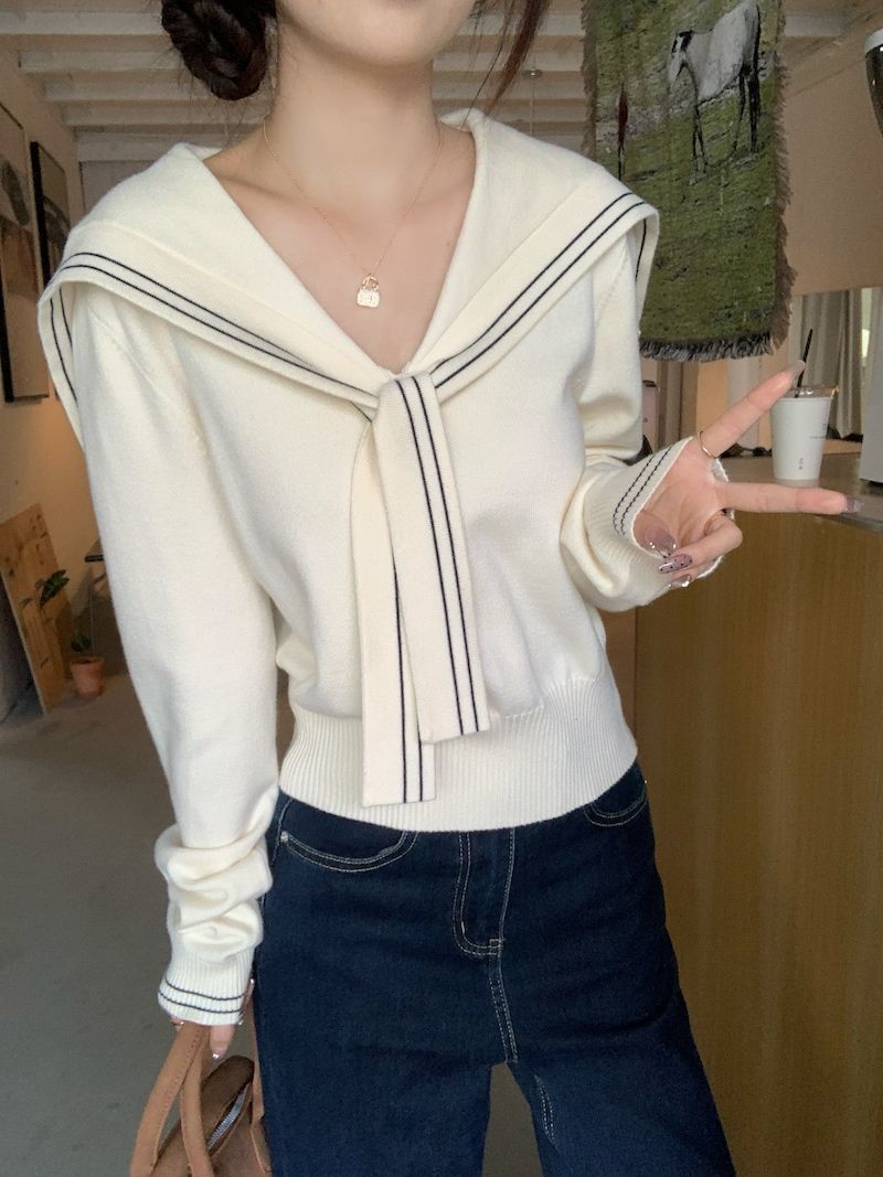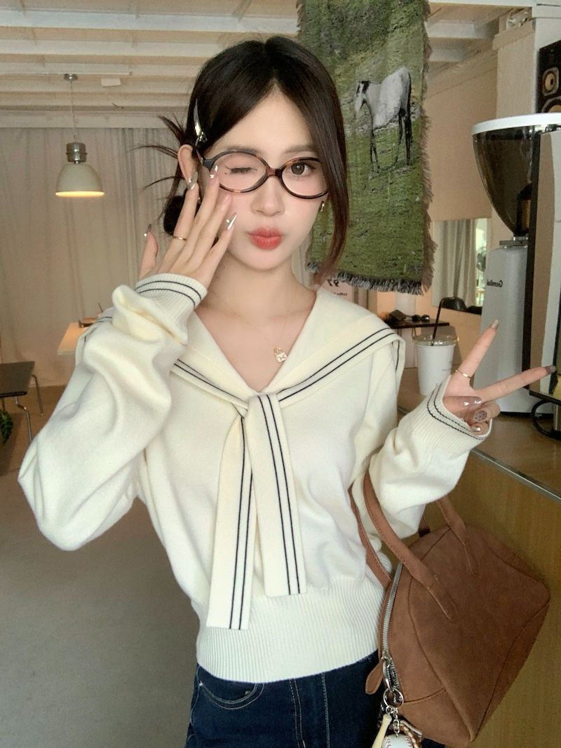 2025早秋新款减龄气质海军领针织衫甜美韩系收腰修身针织长袖上衣