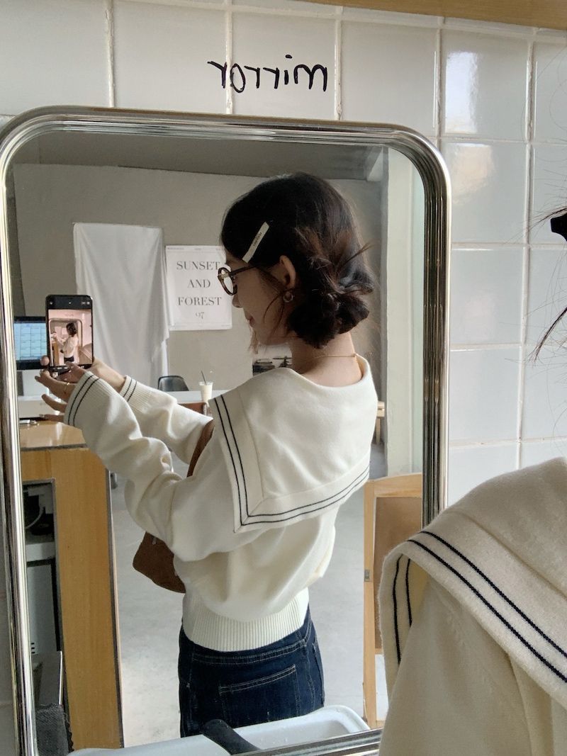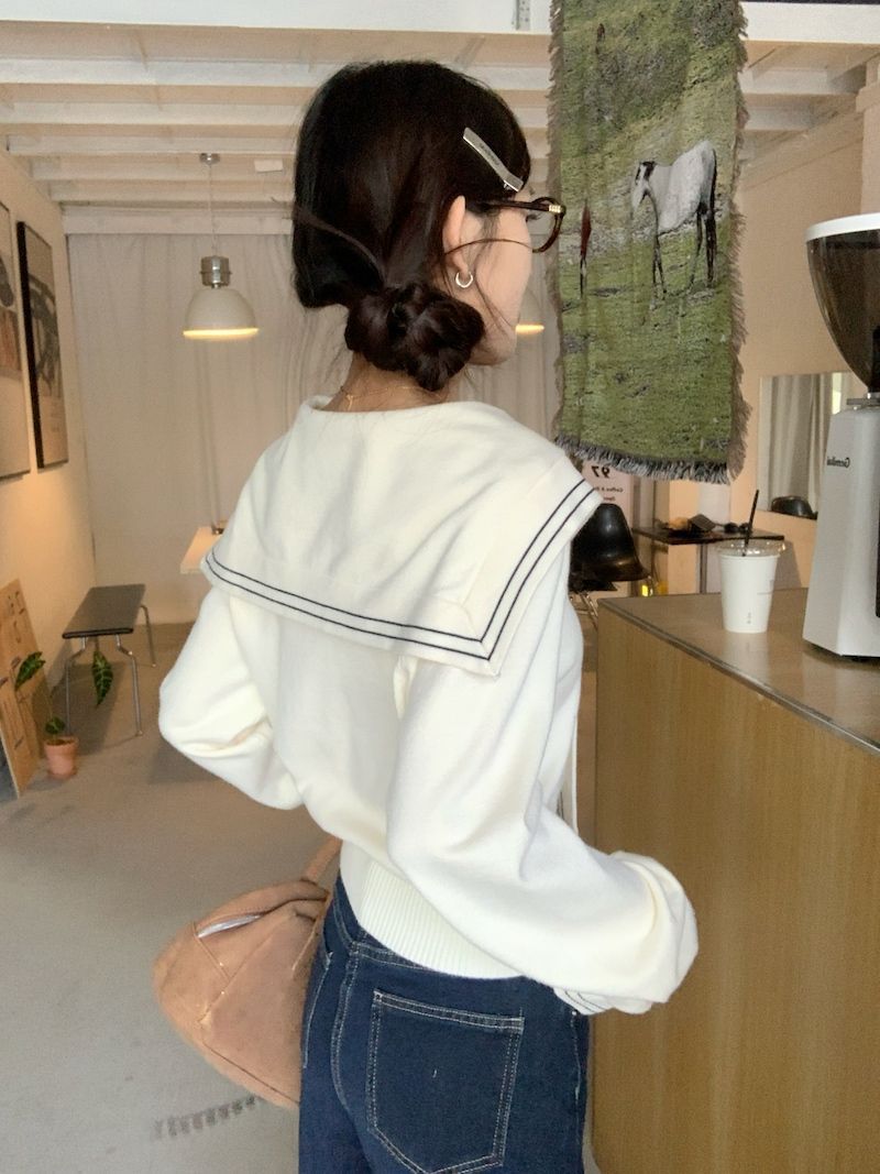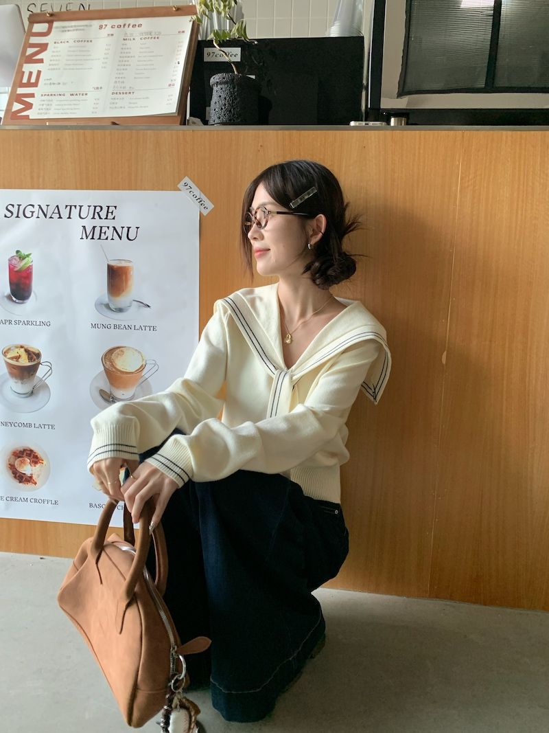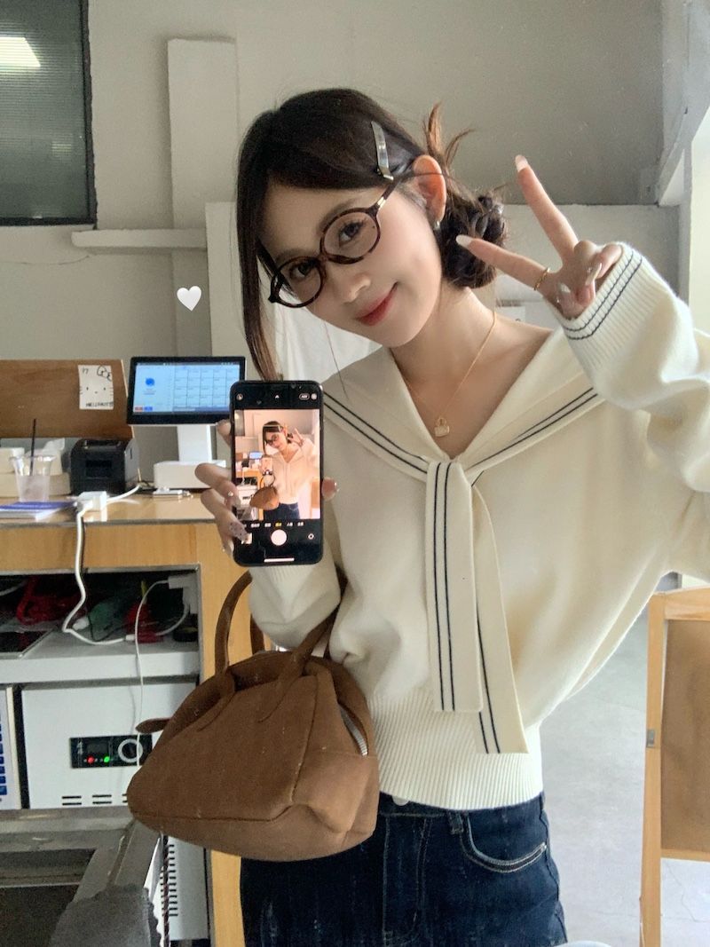 2025早秋新款减龄气质海军领针织衫甜美韩系收腰修身针织长袖上衣