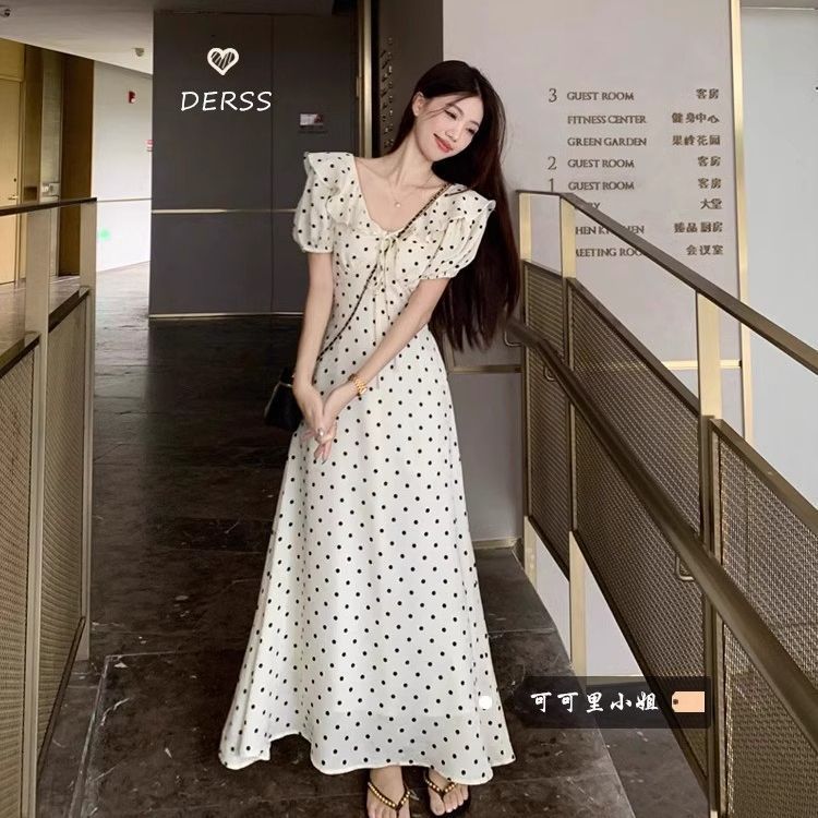 2025 夏の新フレンチレトロ水玉レースアップパフスリーブウエスト痩身ロングスカートドレス女性のシックな