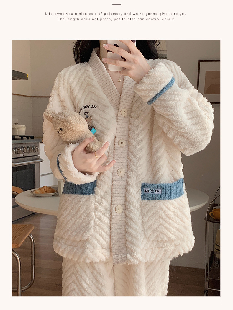 300G法兰绒加厚睡衣女士秋冬季保暖开衫长袖长裤家居服可外穿套装