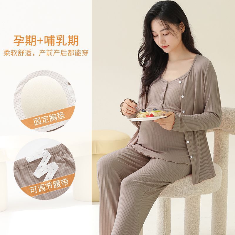 月子服妊婦モーダルパジャマ女性春秋胸パッド付き三点セット吸汗通気性授乳ホームウェア