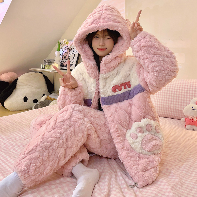 2023年コーラルベルベットのパジャマ女性冬に綿を挟んで三層に厚くなった帽子もかわいいジッパーの甘い家庭服が着ることができる