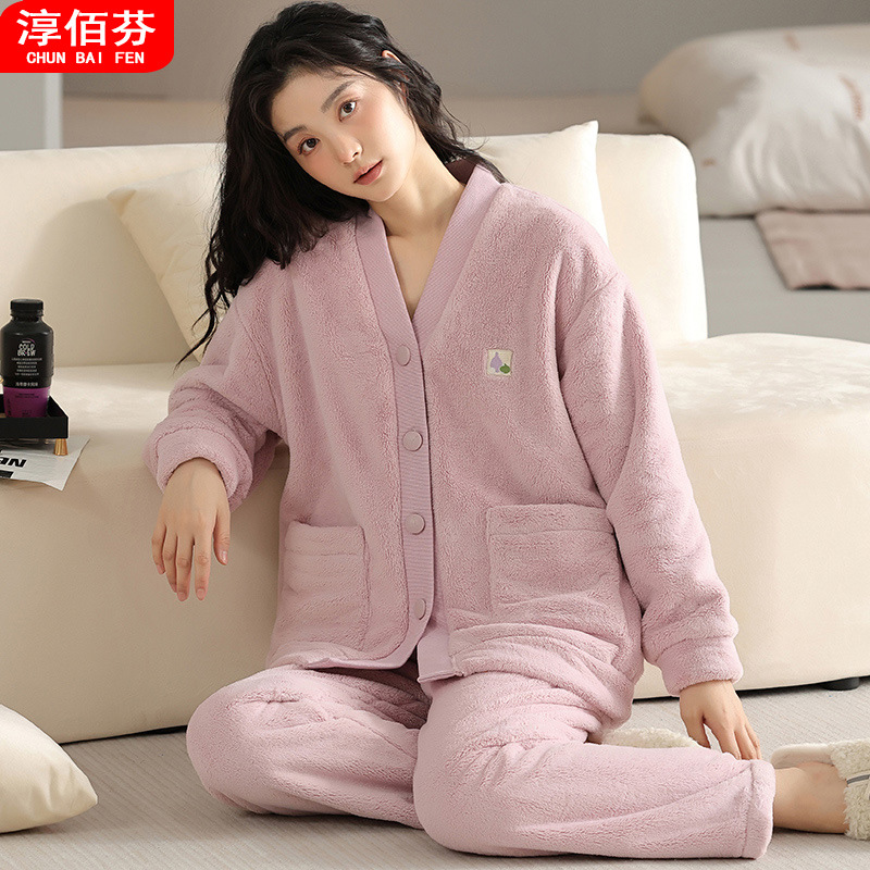 2025秋冬季新款睡衣女双面法兰绒长袖加厚保暖纽扣舒适家居服套装