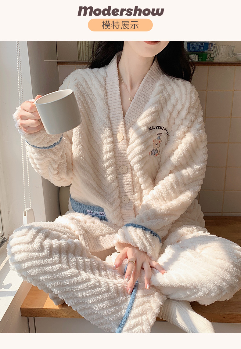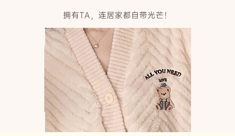 新款V领睡衣女秋冬季珊瑚绒加厚可爱卡通可外穿法兰绒家居服套装