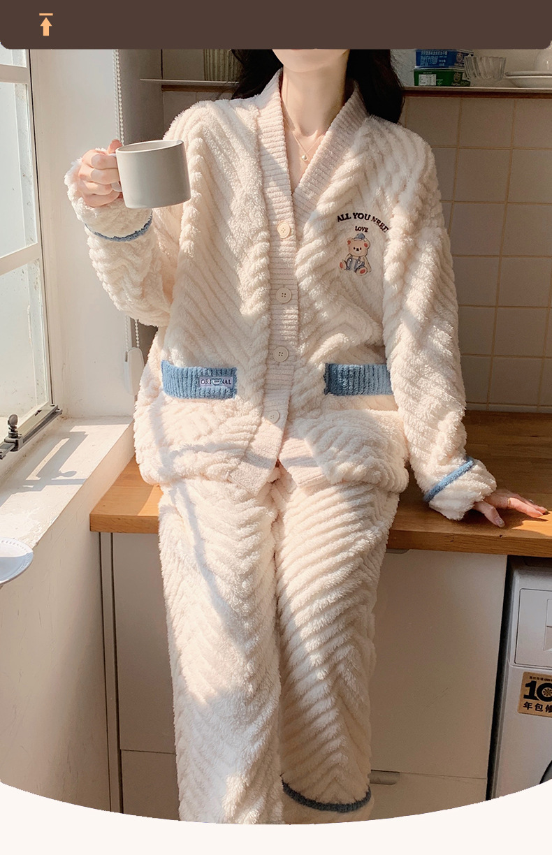 睡衣女秋冬新款可爱卡通开衫珊瑚绒提花绒保暖加厚家居服两件套装