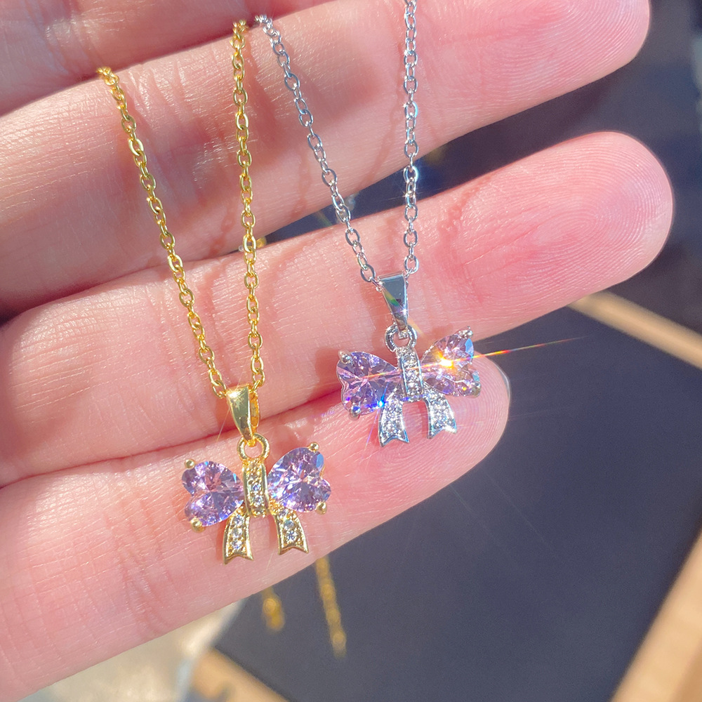 满钻粉色蝴蝶结钛钢项链女小众设计感轻奢锁骨链网红气质饰品批发