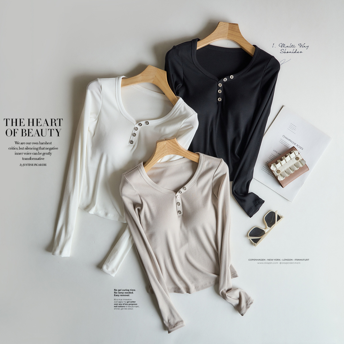 奶油可可 带胸垫纽扣圆领针织t恤长袖修身内搭针织衫上衣女秋衣