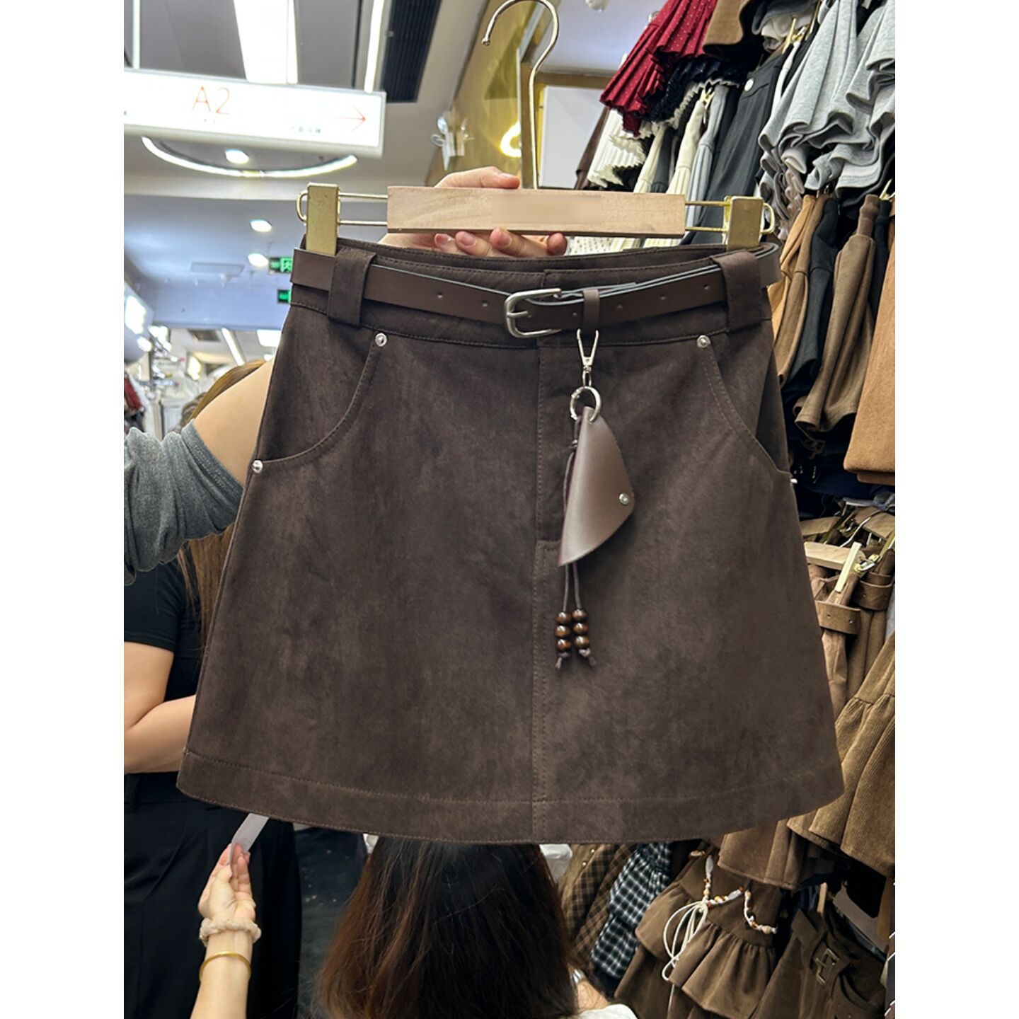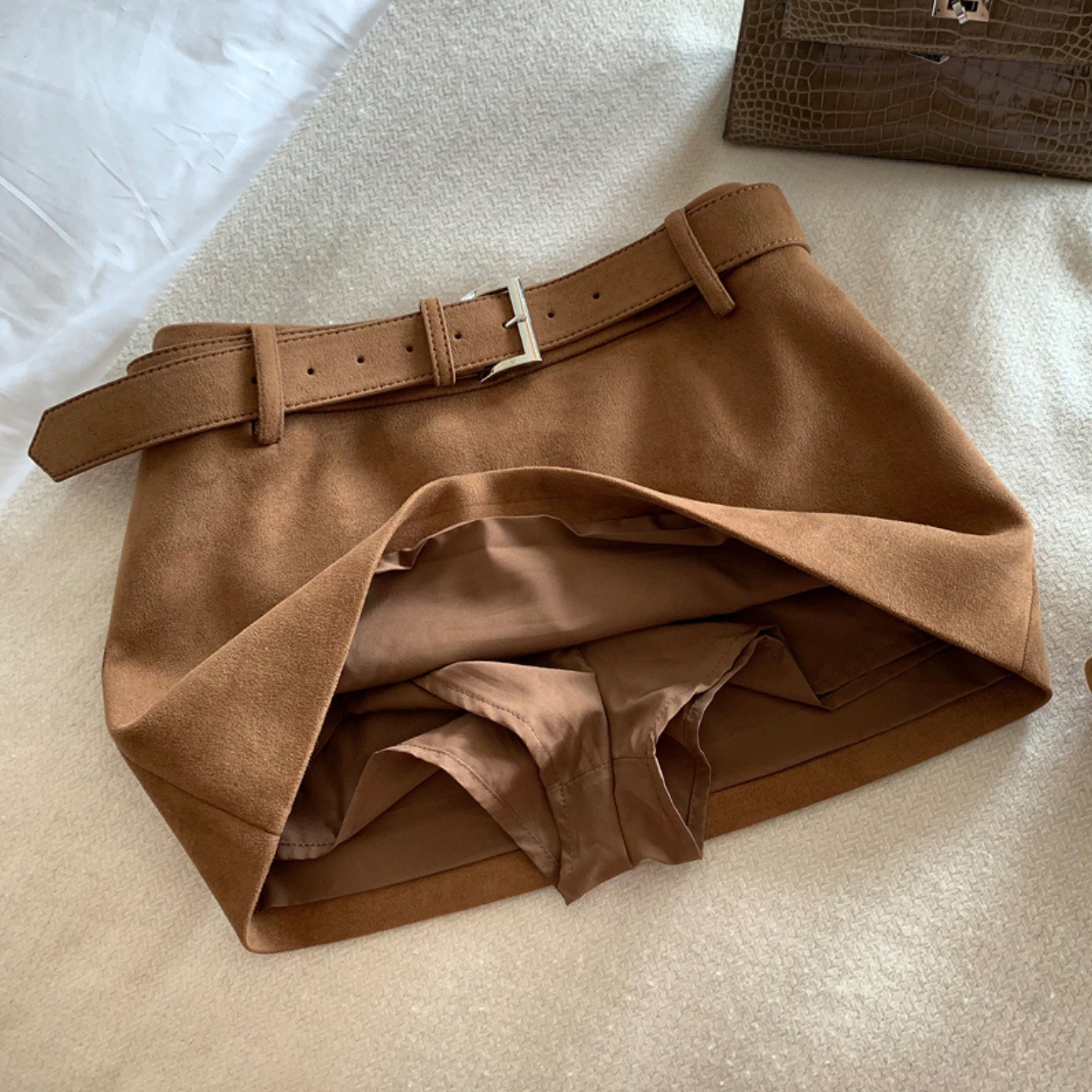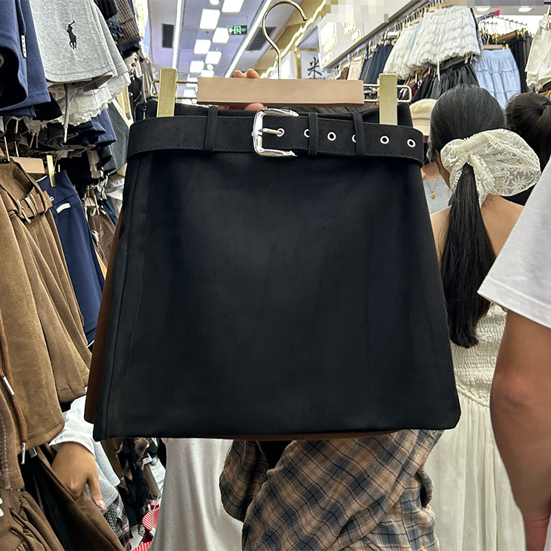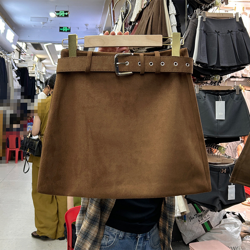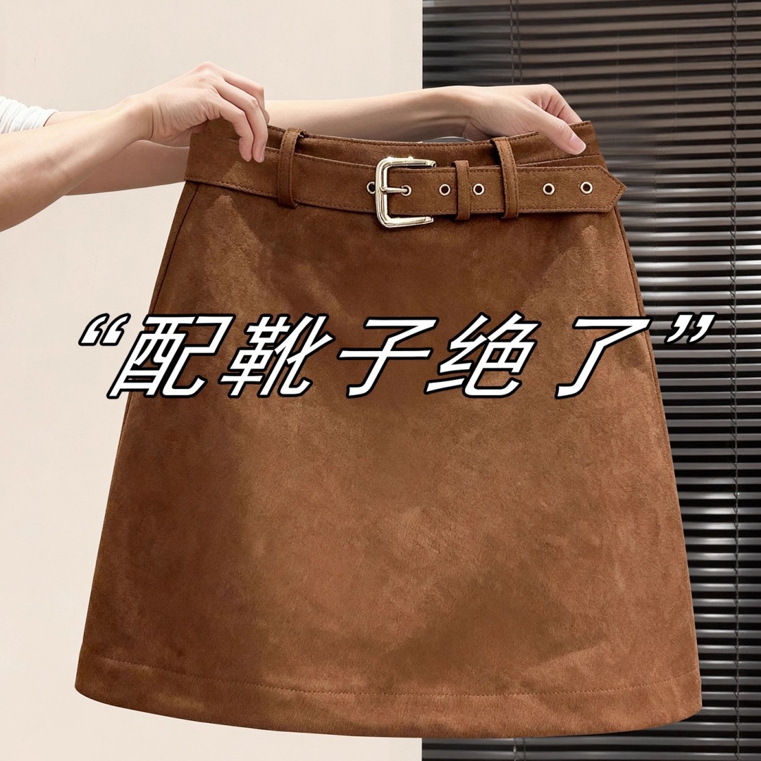 大码韩版复古棕色A字包臀短裙春秋新款配腰带高腰麂皮绒半身裙女