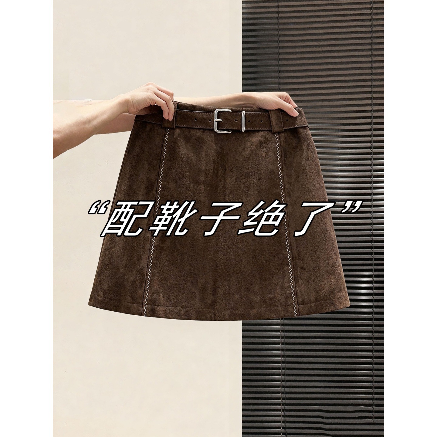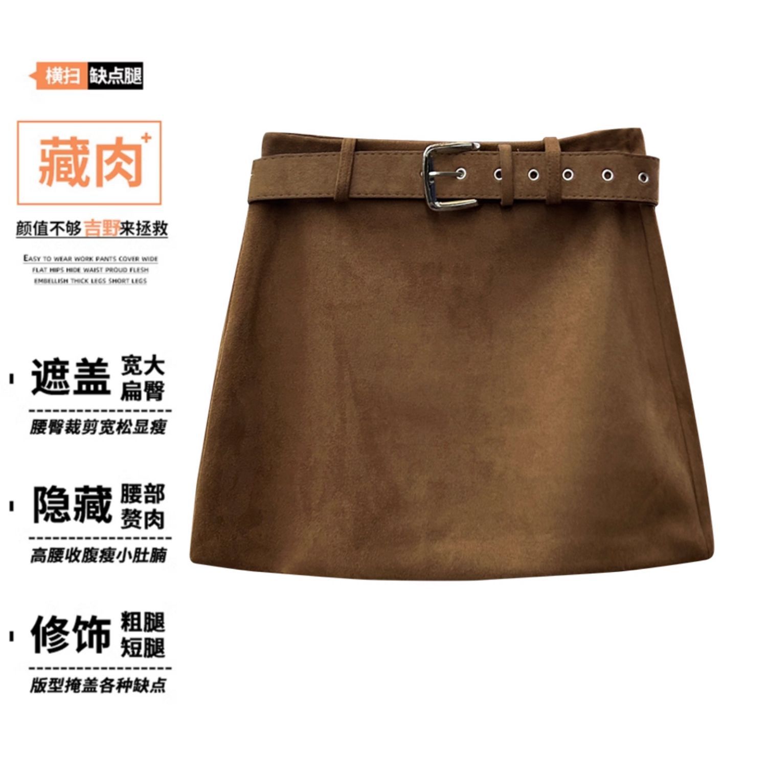 配腰带美拉德咖色半身裙女大码秋冬季新款复古高腰麂皮绒包臀短裙