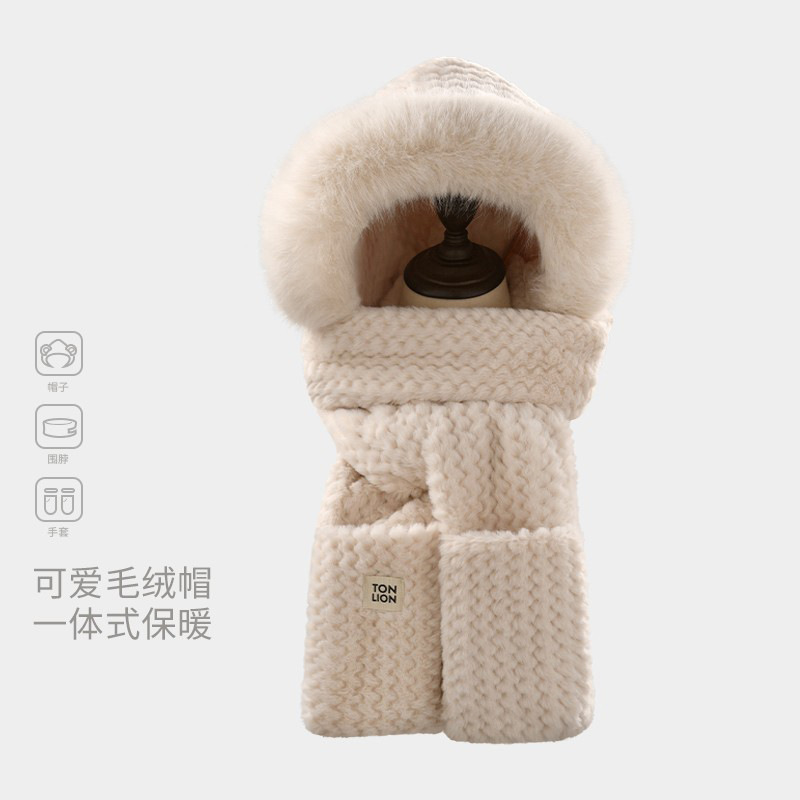 2025新款可爱毛绒帽子围巾一体女冬季骑行防风保暖护耳连帽三件套