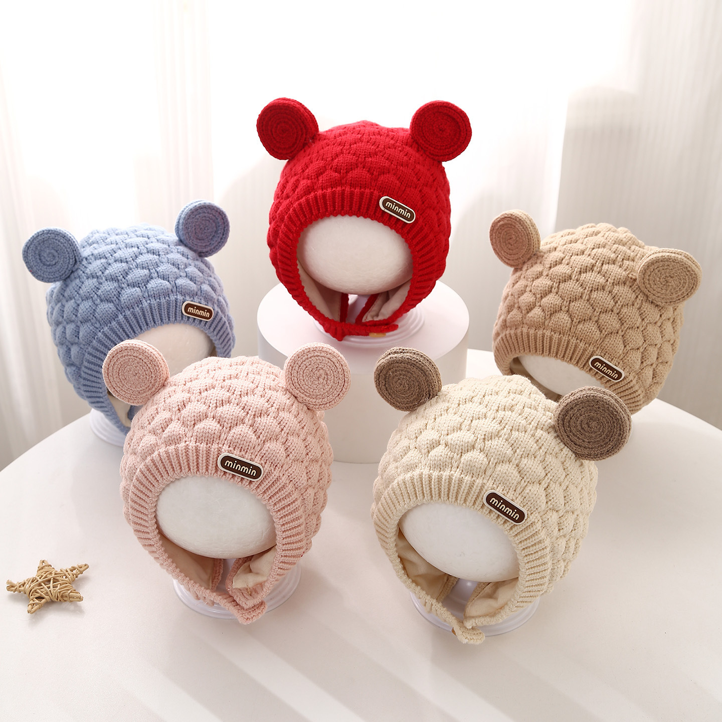 婴儿帽子秋冬男童针织帽小月龄宝宝双层保暖针织帽可爱系绳护耳帽