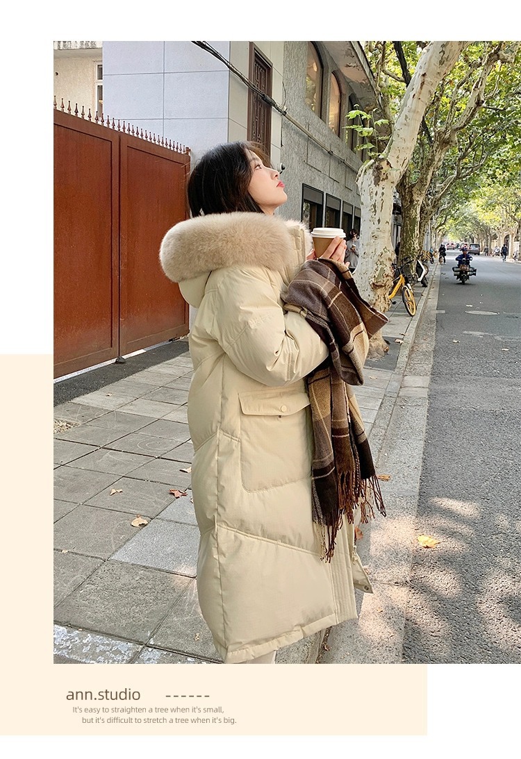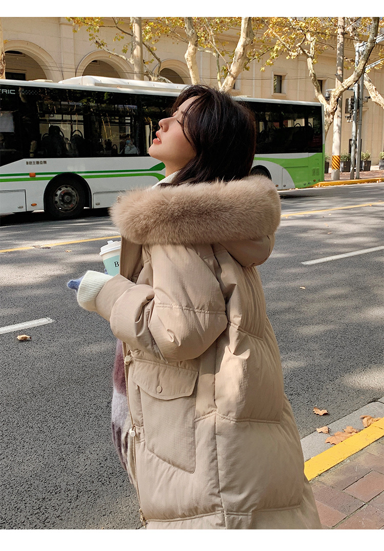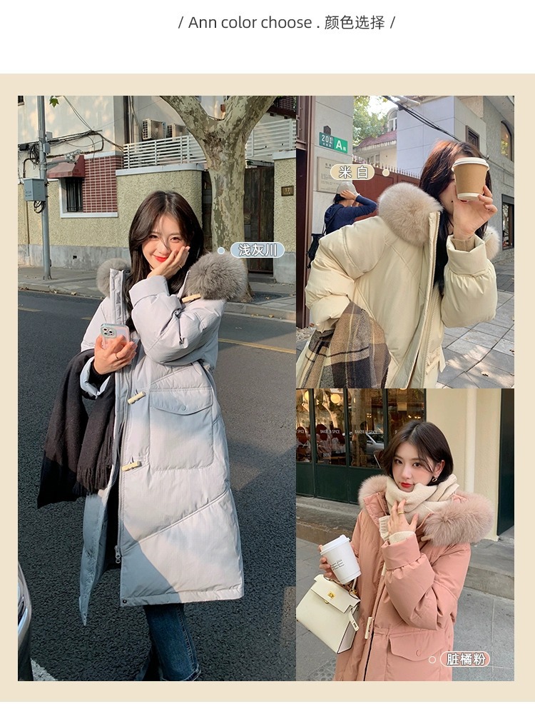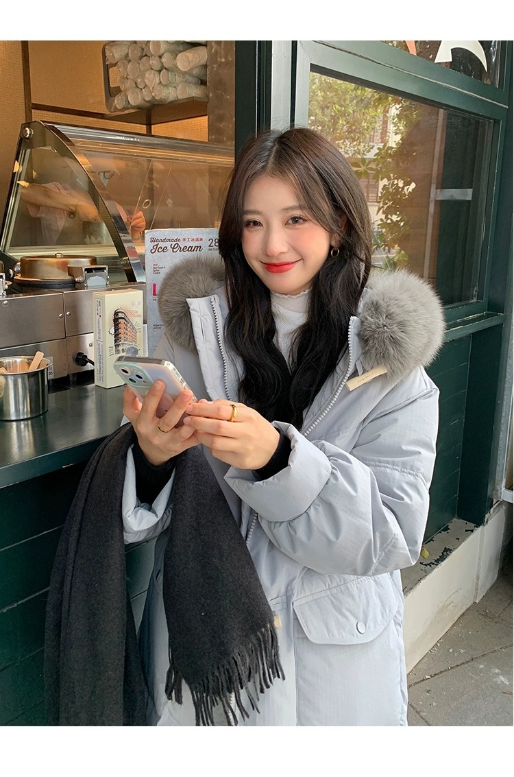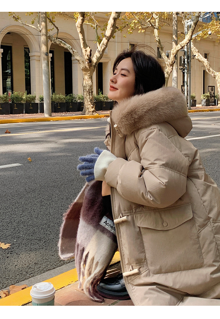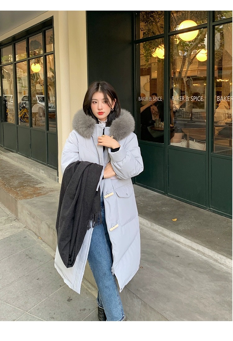 平湖羽绒服女中长款韩版宽松加厚白鸭绒小个子大毛领狐狸毛设计感