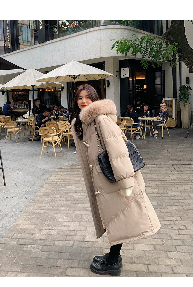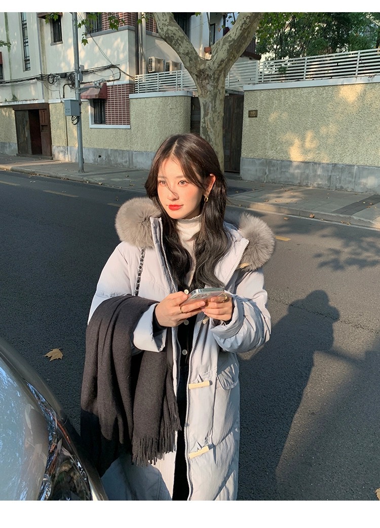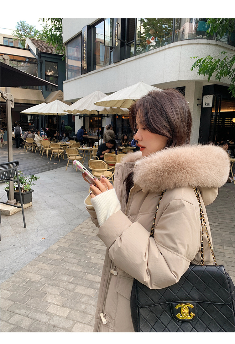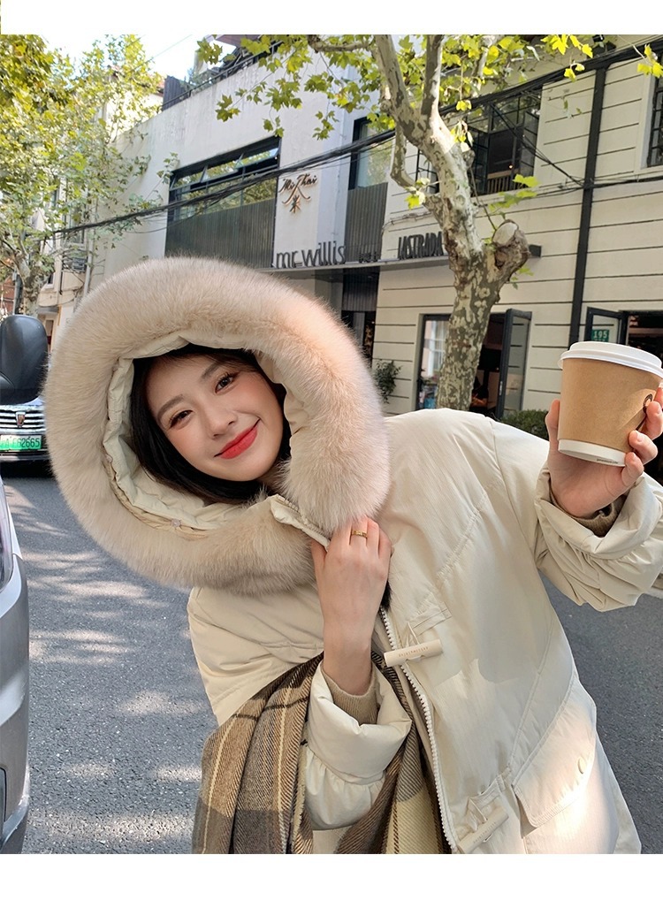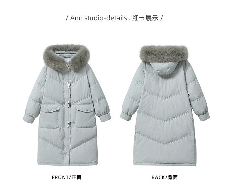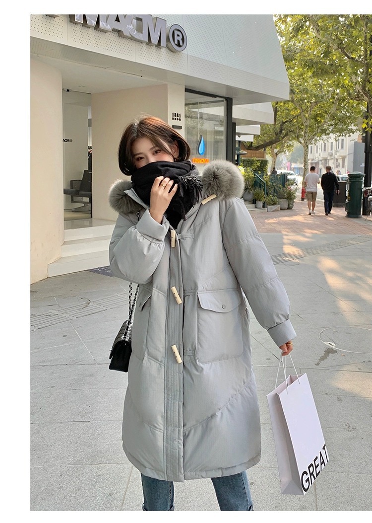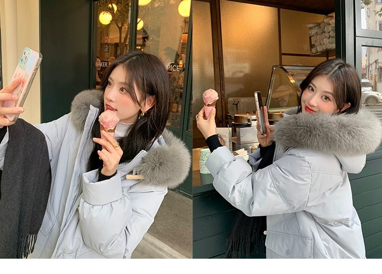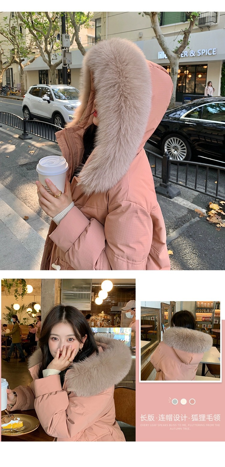 平湖羽绒服女中长款韩版宽松加厚白鸭绒小个子大毛领狐狸毛设计感