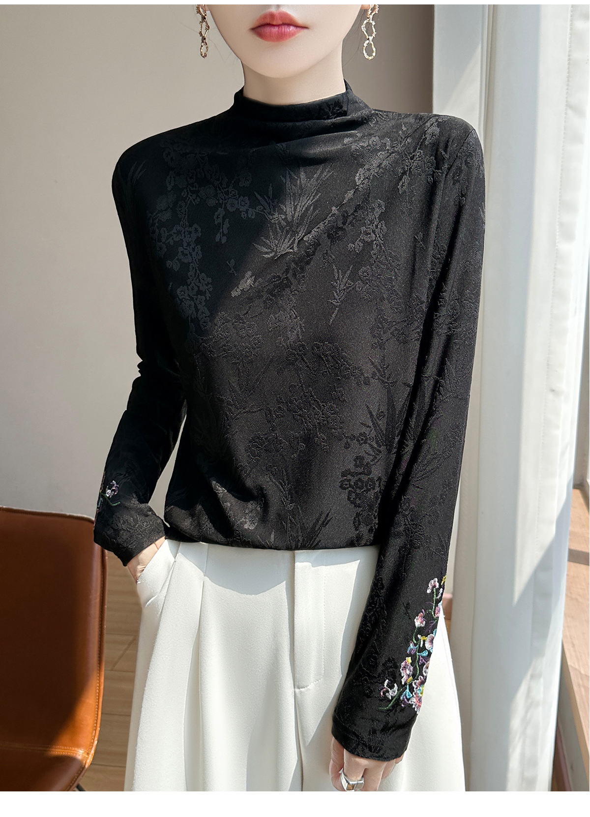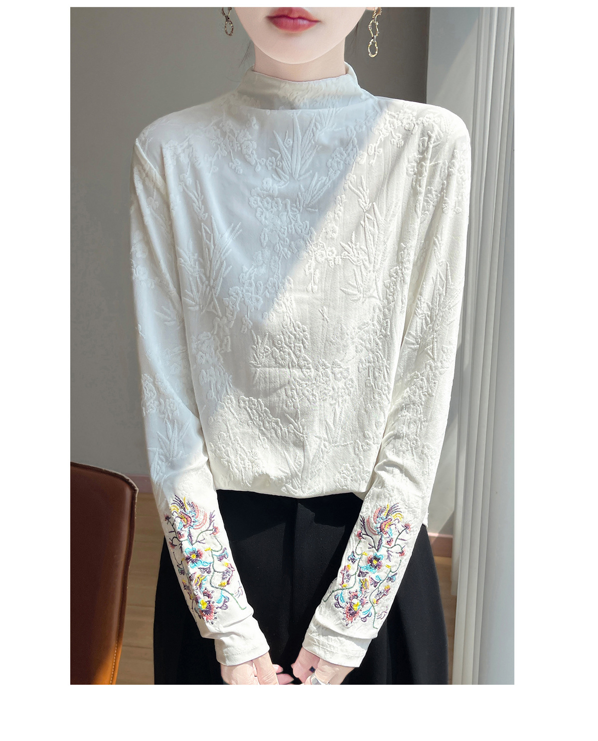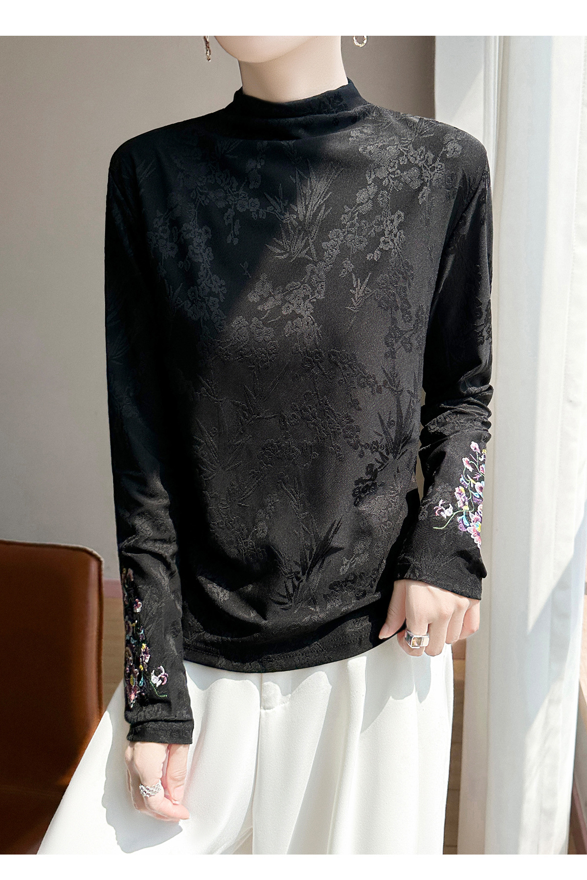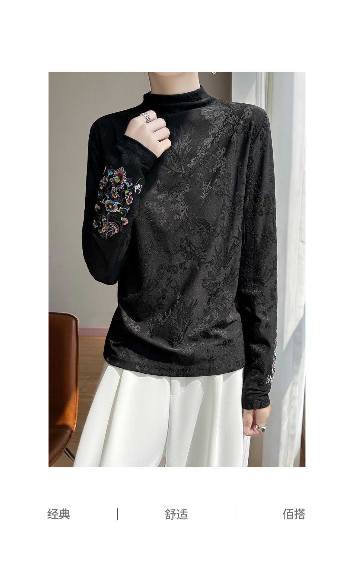 提花刺绣打底衫2025秋冬季文艺国风半高领气质修身加绒打底衫女
