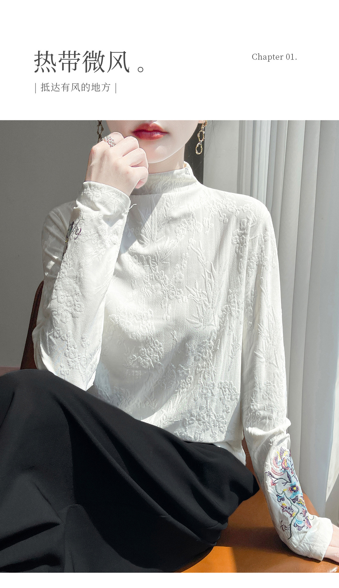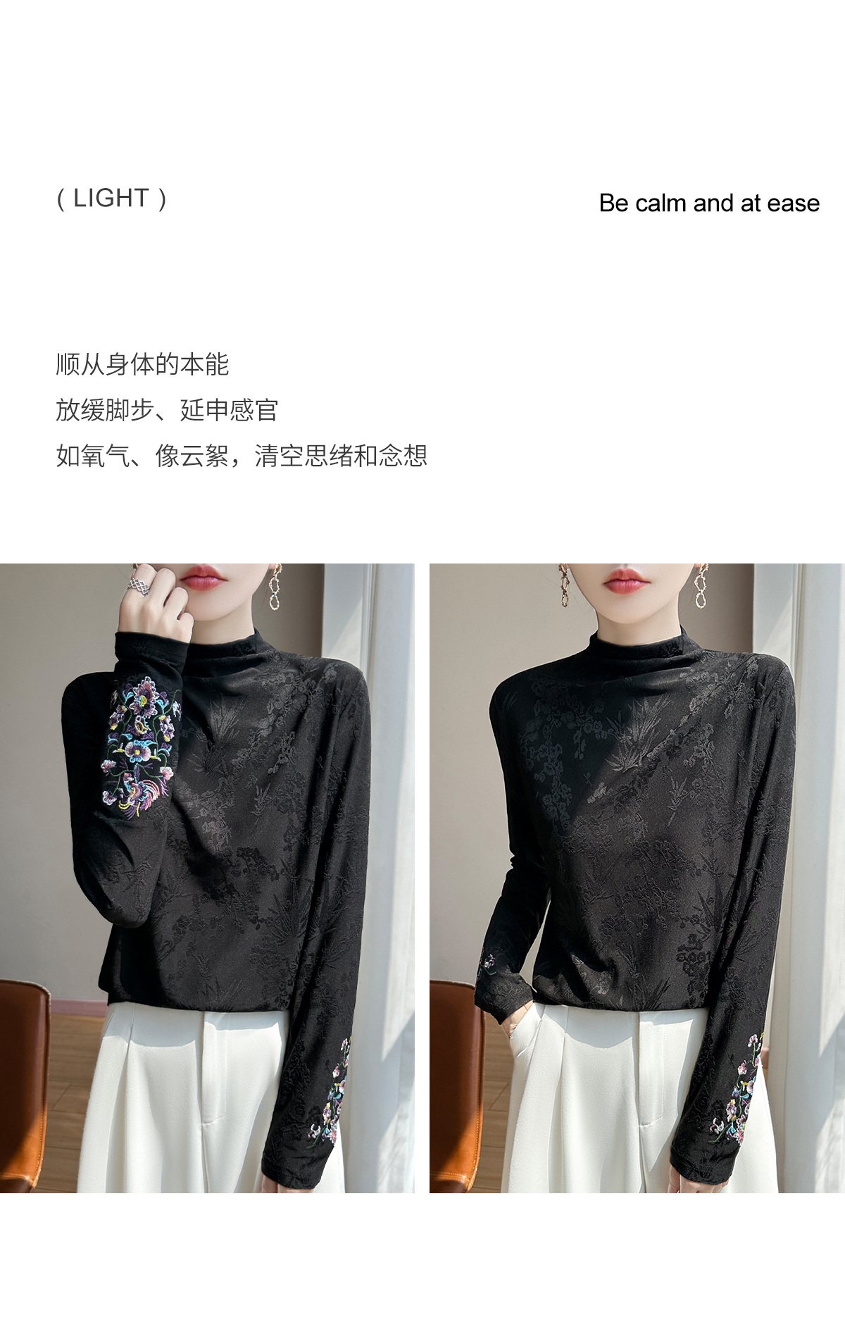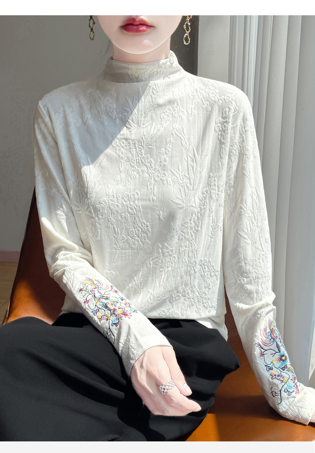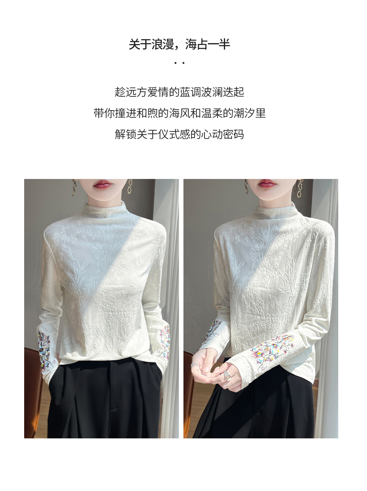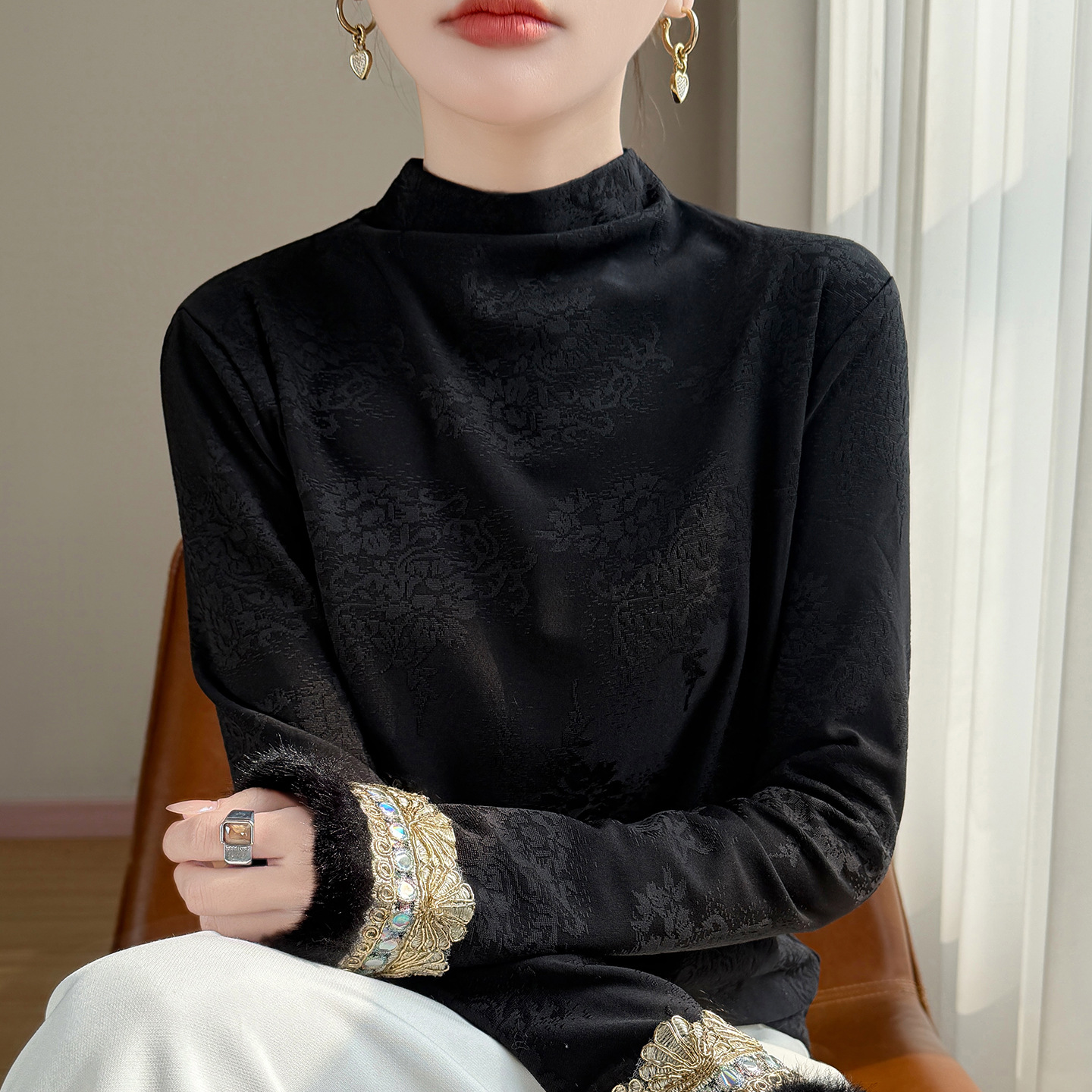 提花刺绣打底衫2025秋冬季文艺国风半高领气质修身加绒打底衫女