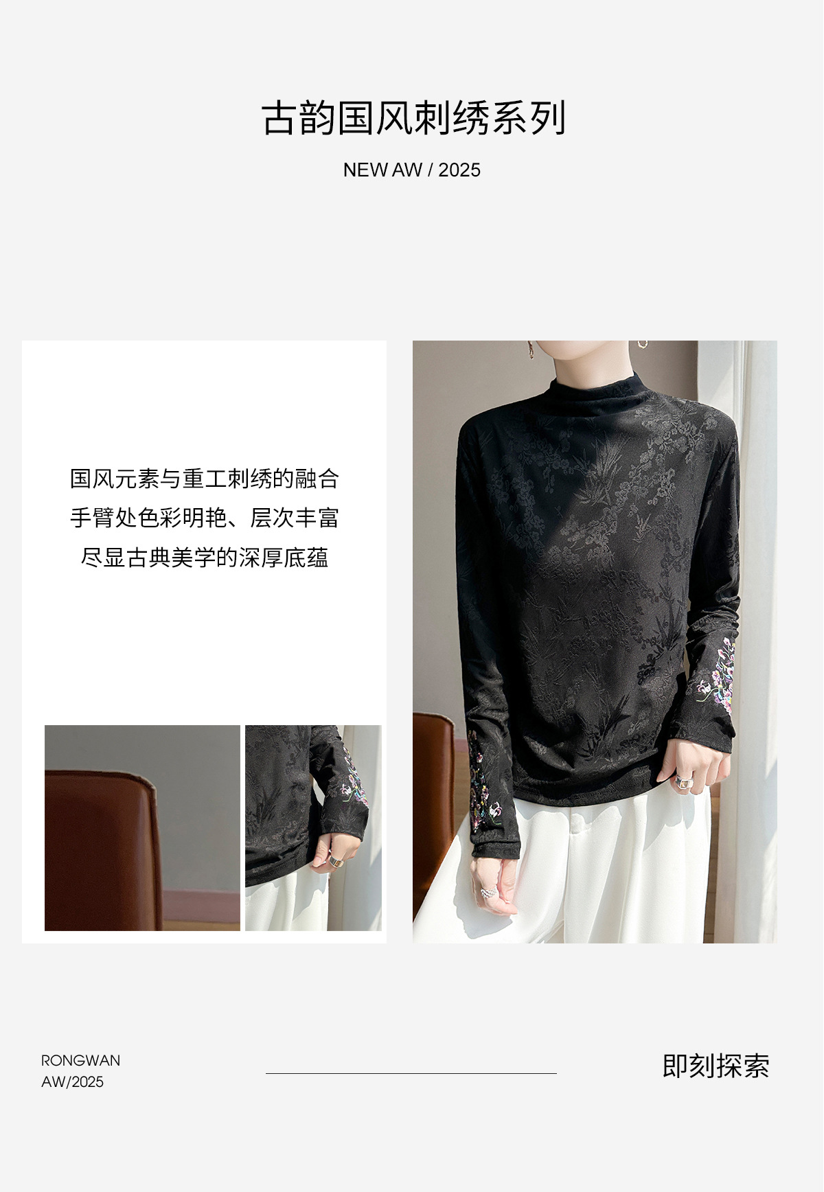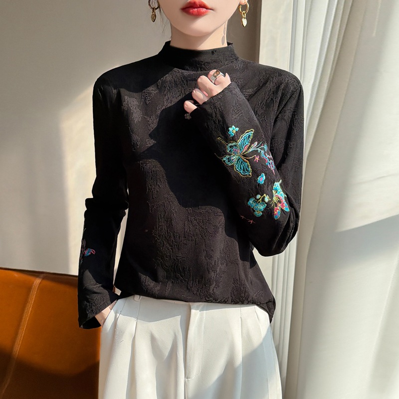 半高领新中式国风打底衫女秋冬款复古休闲重工刺绣民族风长袖T恤