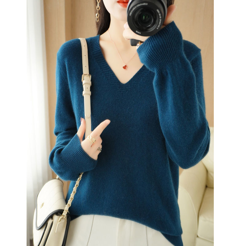 クロスボーダー春秋レディースVネックショート丈プルオーバー、スリムフィット無地ニットセーター、柔らかく万能なトップス