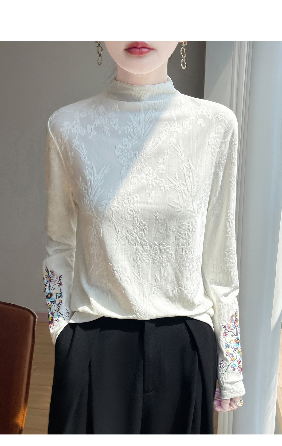 秋冬新作 ハーフタートルネック 両面ドイツ製ベルベットニット レディース 長袖 中国風刺繍 ソフトで暖かい冬用トップス
