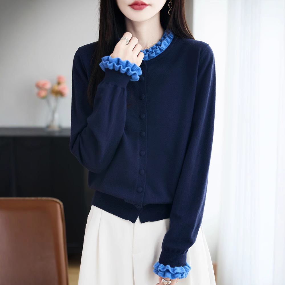 跨境2025秋季新款木耳边撞色宽松时尚针织衫上衣长袖安迪绒针织衫