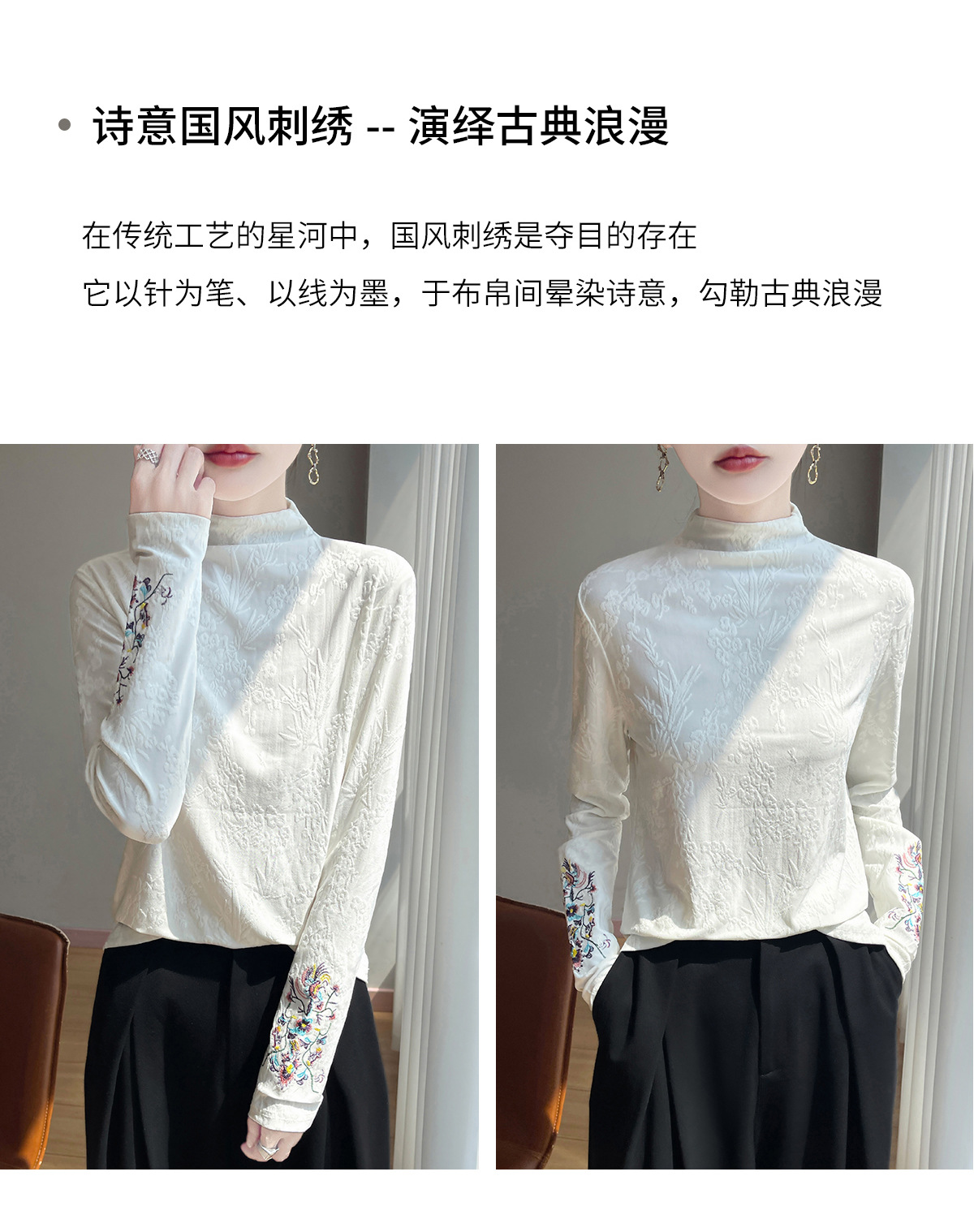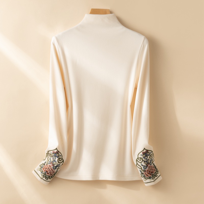 新中式国风刺绣半高领加绒打底衫秋冬加厚磨毛上衣保暖复古毛衣