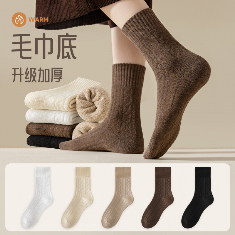 毛圈袜子女中筒袜秋冬款加绒加厚保暖长袜冬季毛绒麻花地板袜批发