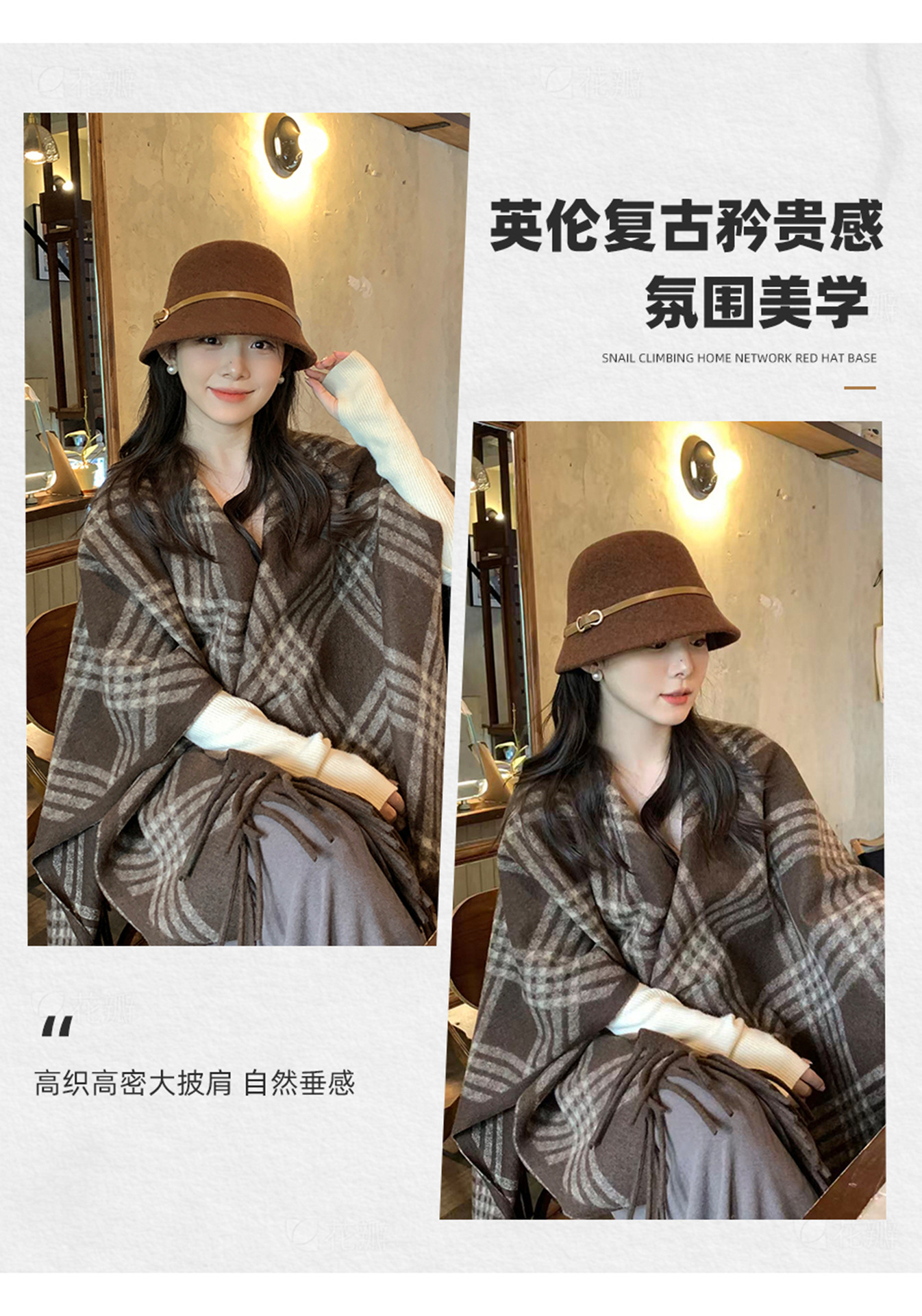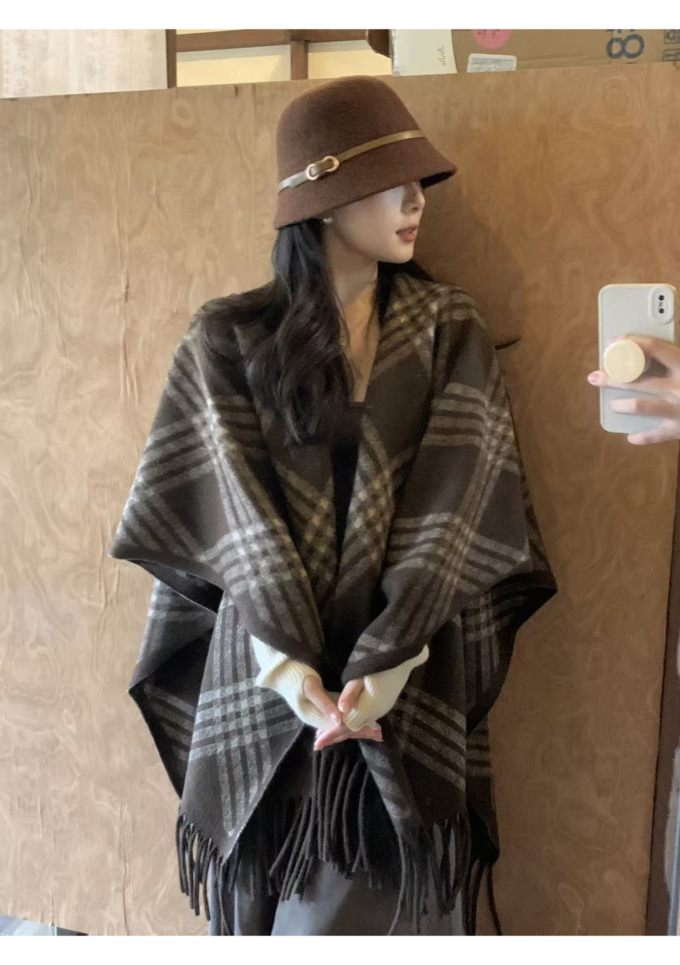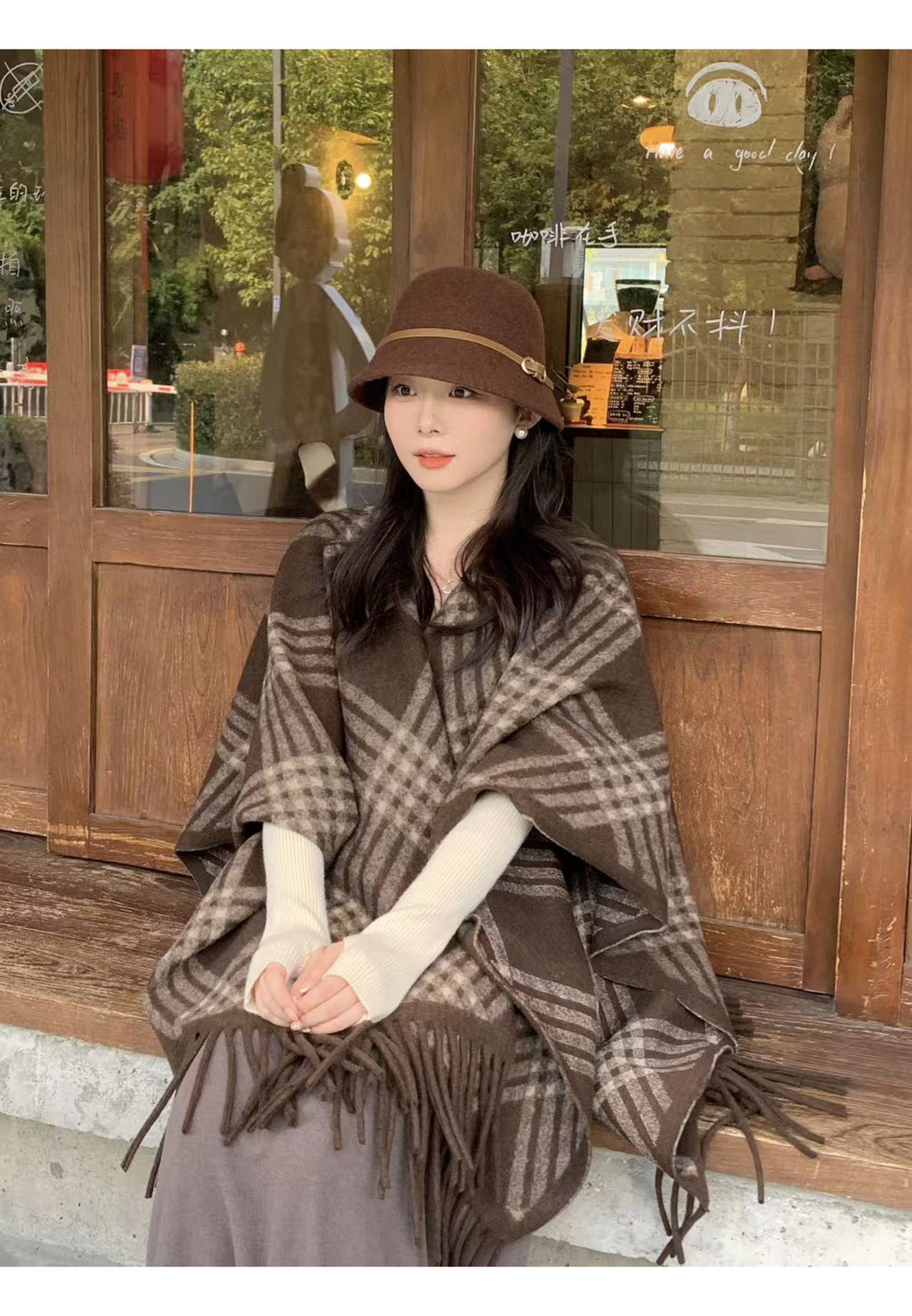 复古英伦风格纹大披肩女秋冬高级感保暖斗篷外搭时尚流苏围巾披风