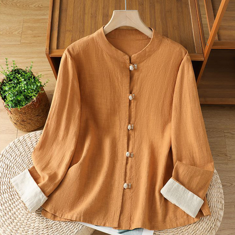 2025 新中国風のレトロな綿とリネンのシャツ女性のための春と夏の中国風のスタンドアップカラーボタン付きトップ斜め襟刺繍茶服