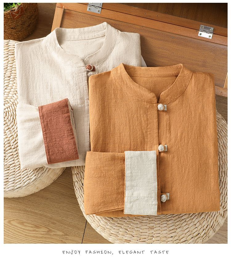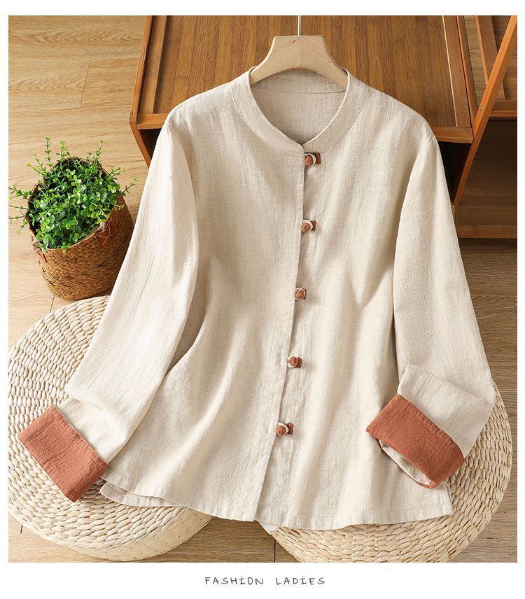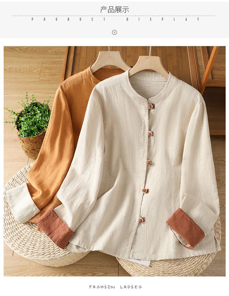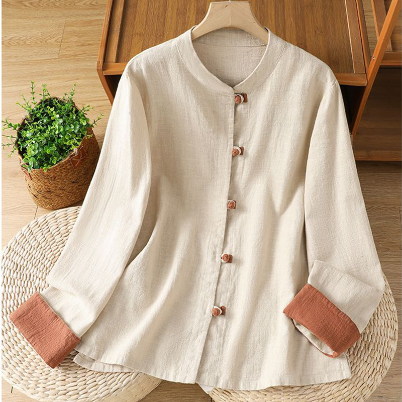 新中式立领外套上衣棉麻长袖衬衫女装春秋季新款撞色复古国风盘扣