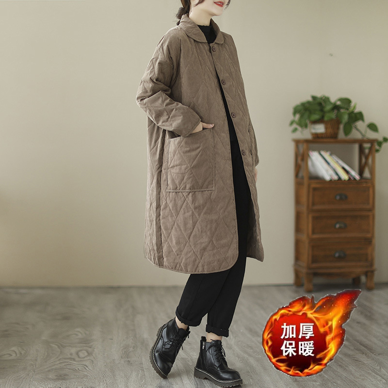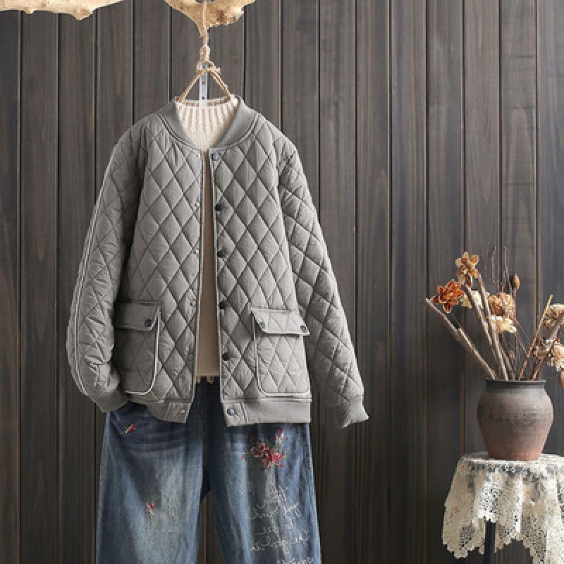 2024年冬新作、ヴィンテージ風菱形格子柄中綿入りコート、多用途で暖かい綿入れジャケット