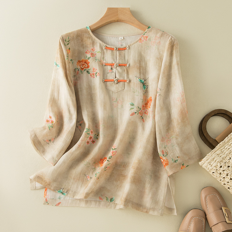 実写スポット風レトロ夏新作上着女性盤口デザイン感小衆綿麻シックシャツ