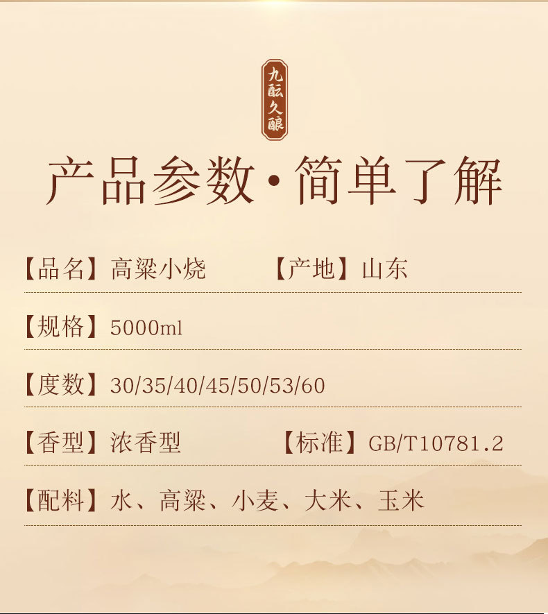 包装规格 高粱小烧30度,高粱小烧35度,高粱小烧40度,高粱小烧45度,高粱小烧50度,高粱小烧53度,高粱小烧60度