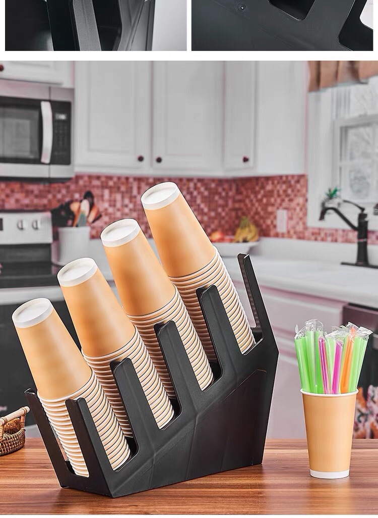 工場卸売りミルクティーコーヒーカップ棚使い捨て紙コップ棚黒斜め四格収納アクリルカップ取り器
