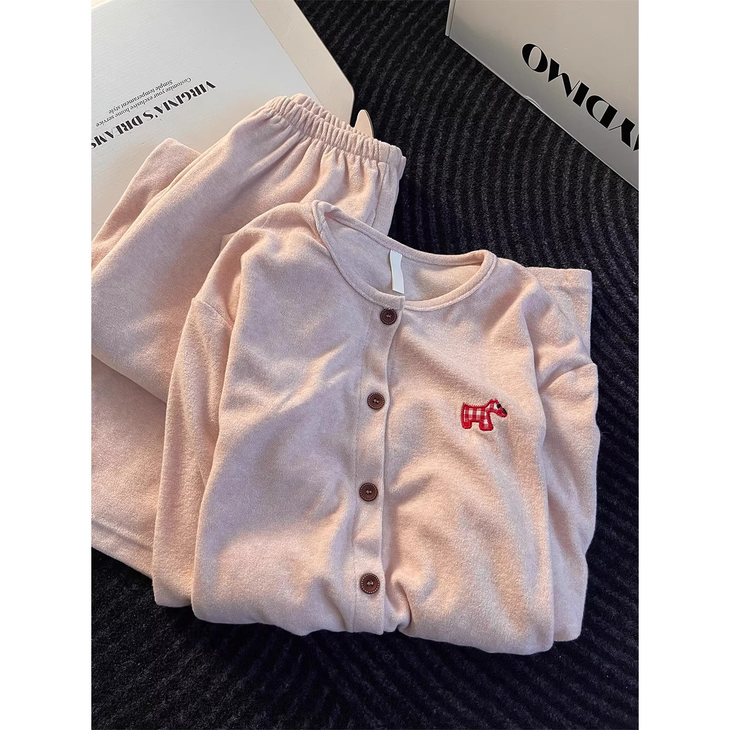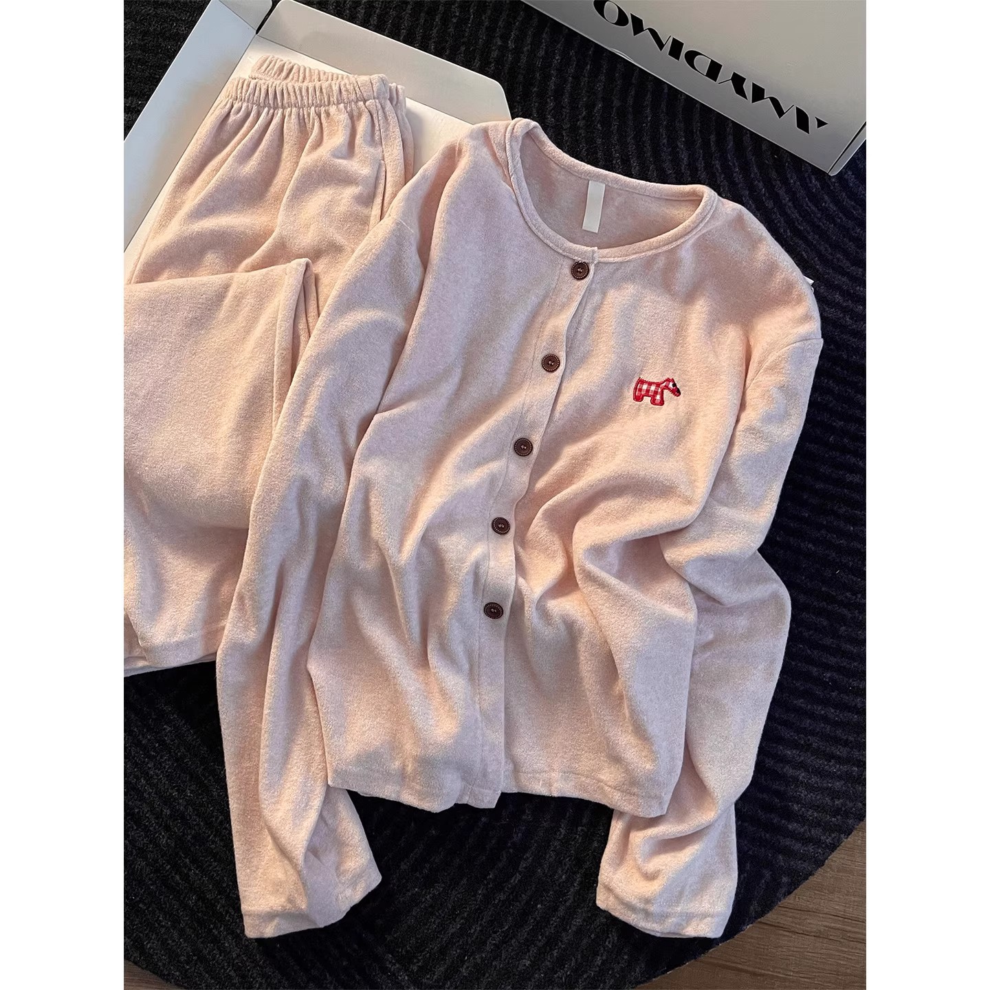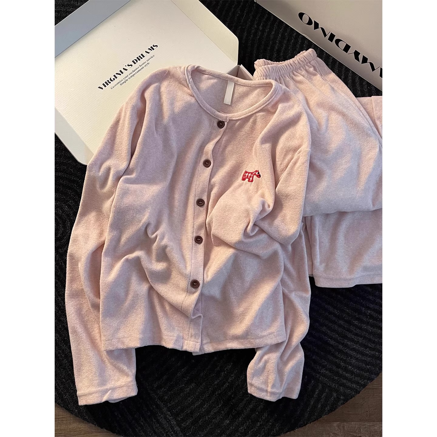 圆领德绒睡衣女秋冬季慵懒卡通刺绣甜美少女长袖长裤家居服可外穿