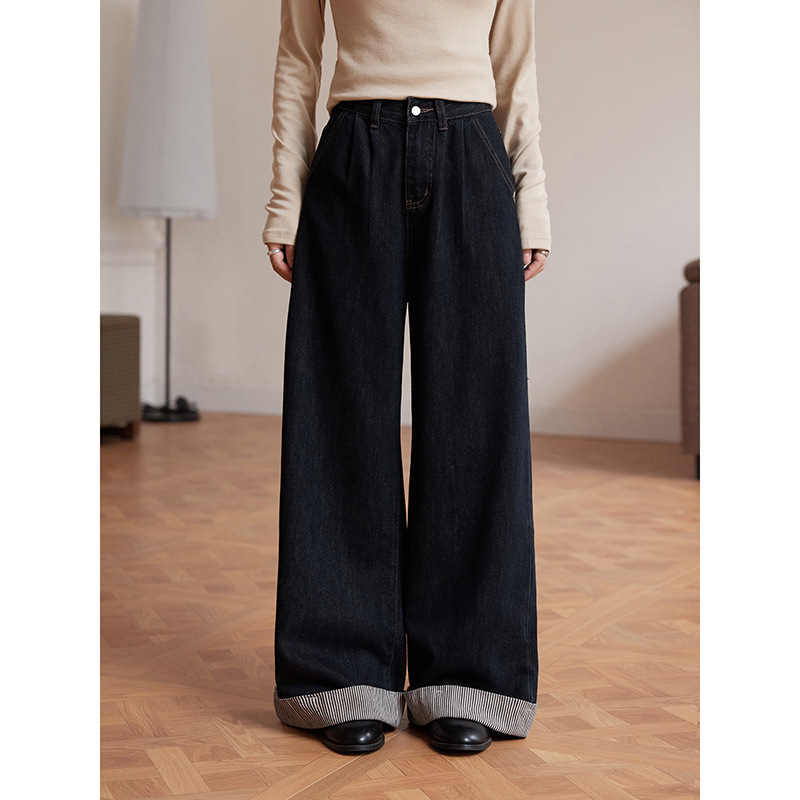 【牛皮纸】歌铭法式复古拼接条纹卷边裤脚牛仔裤秋季阔腿裤N605C
