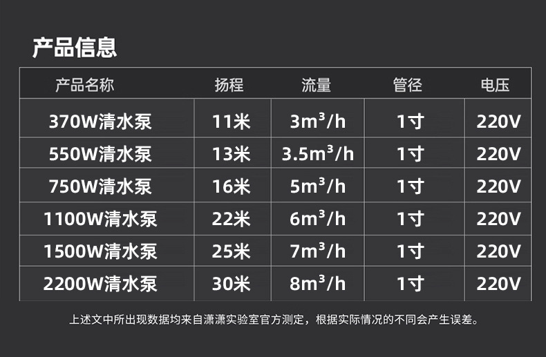 规格 清水泵370W+5m线,清水泵370W+10m线,清水泵370W+20m线,清水泵550W+5m线,清水泵550W+10m线,清水泵550W+20m线,清水泵750W+10m线,清水泵750W+20m线,清水泵1100W+10m线,清水泵1100W+20m线,清水泵1500W+10m线,清水泵1500W+20m线,清水泵2200W+10m线,清水泵2200W+20m线,污水泵750W+2寸+10m线,污水泵1500W+2寸+10m线