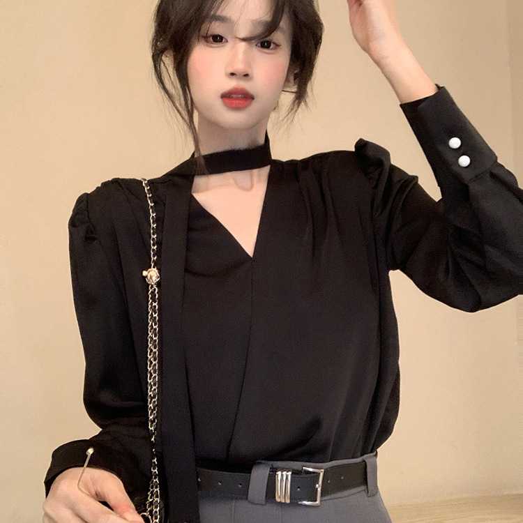 フランス式の軽くて豪華な気質の名媛は首のシャツの女性の春秋の婦人服の独特なシャツの高級感の長袖のストラップの上着を掛けます。