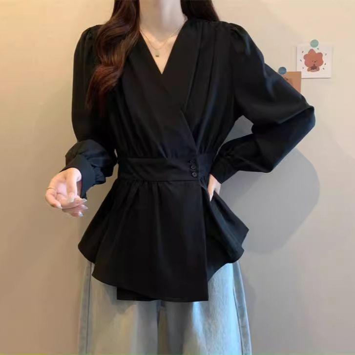 大码法式气质高级感黑色长袖衬衫女春秋胖mm收腰遮肚v领小衫上衣