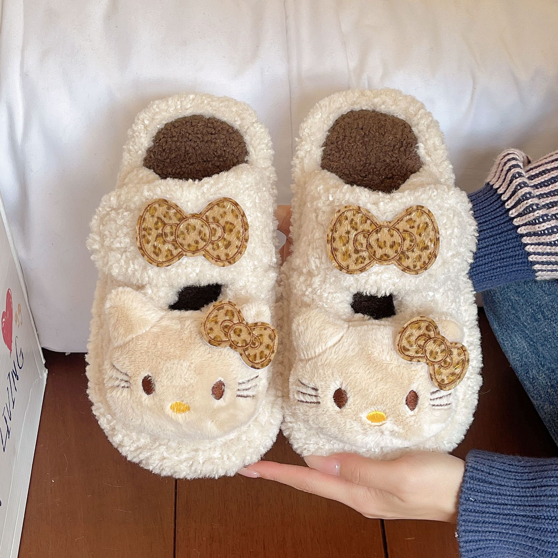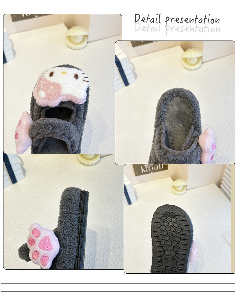 中大童可爱HelloKitty豹纹毛毛拖鞋女2025秋冬季新款防滑棉拖鞋女