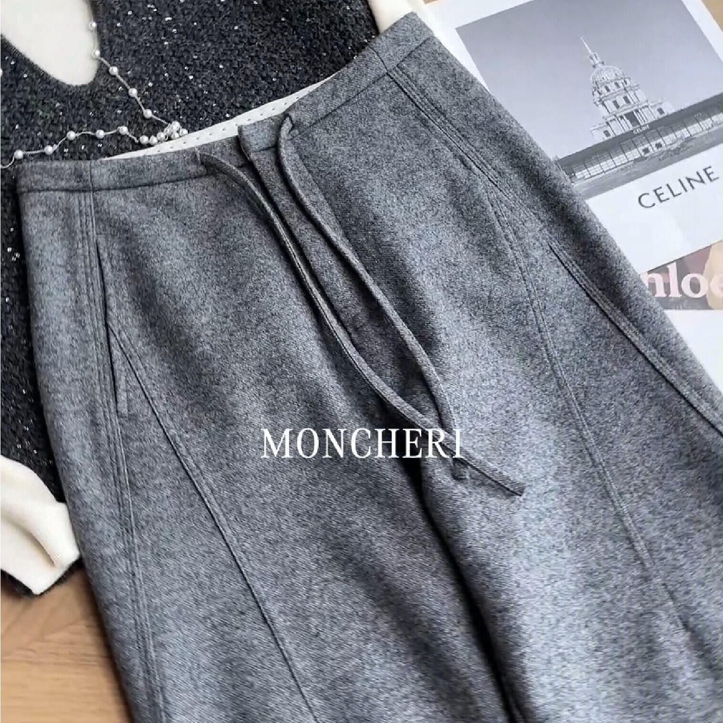 CHAO级推荐!灰色立裁羊毛呢阔腿裤女秋冬新款时髦窄腰抽绳弯刀裤