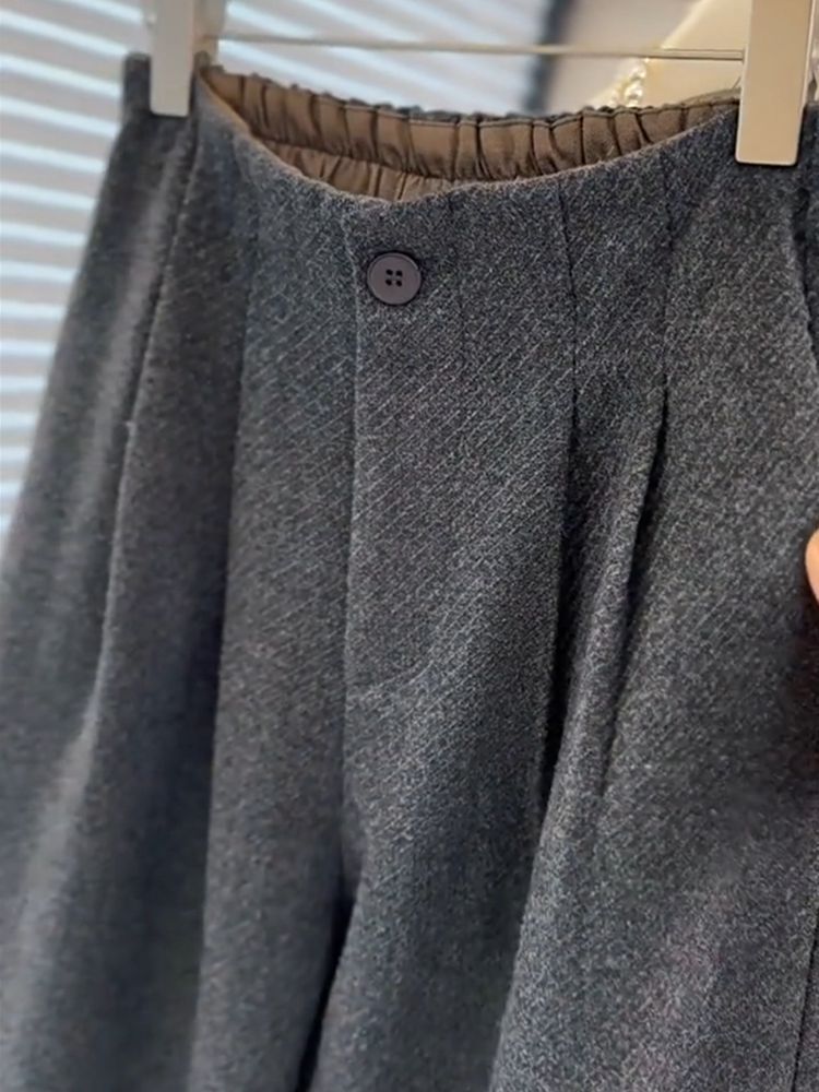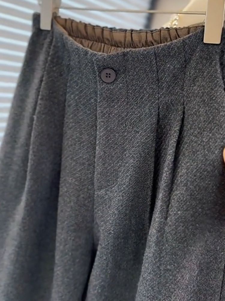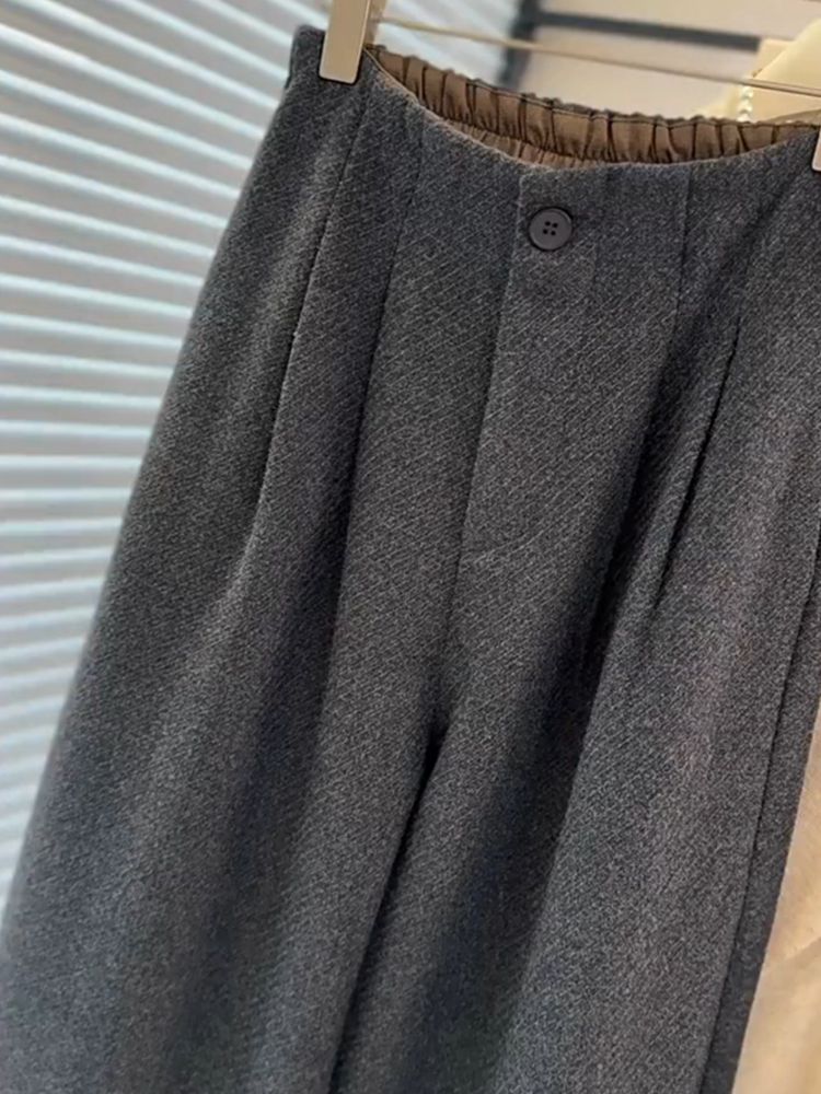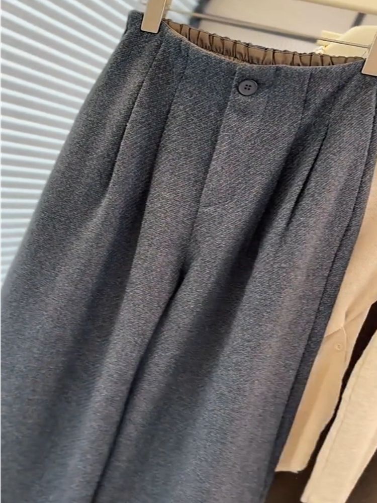 欧货高端灰色压褶后松紧腰气质通勤毛呢西裤女2025新款显瘦阔腿裤