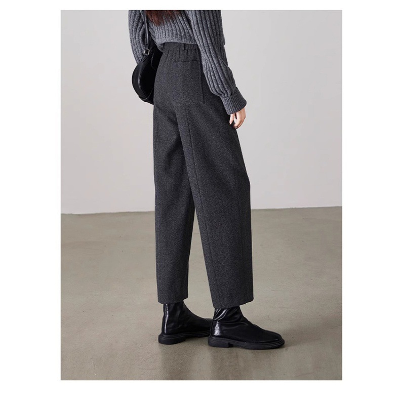 欧货时尚百搭灰色休闲毛呢阔腿裤女秋冬加厚九分哈伦裤窄版直筒裤