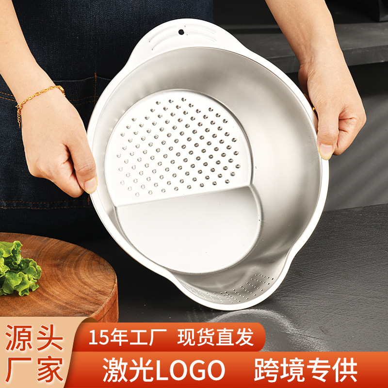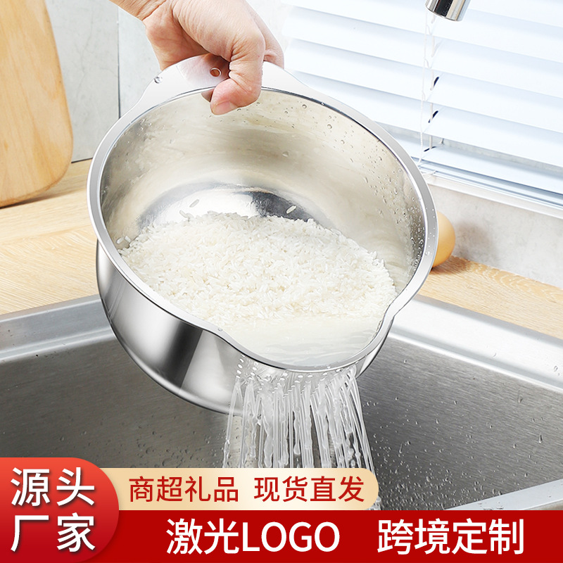 ステンレス製米洗いボウル、米洗い用ザル、野菜洗いボウル、水切りボウル、フルーツ水切りバスケット、家庭用キッチン斜底多機能ボウル