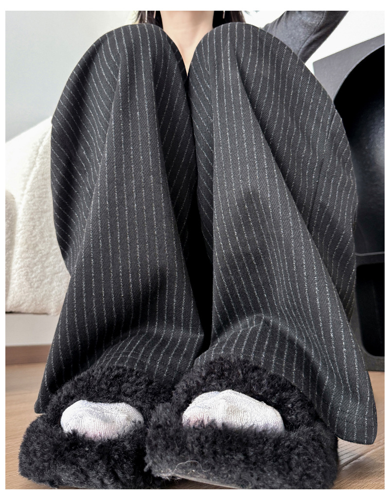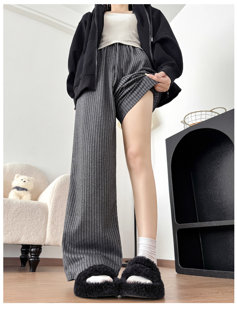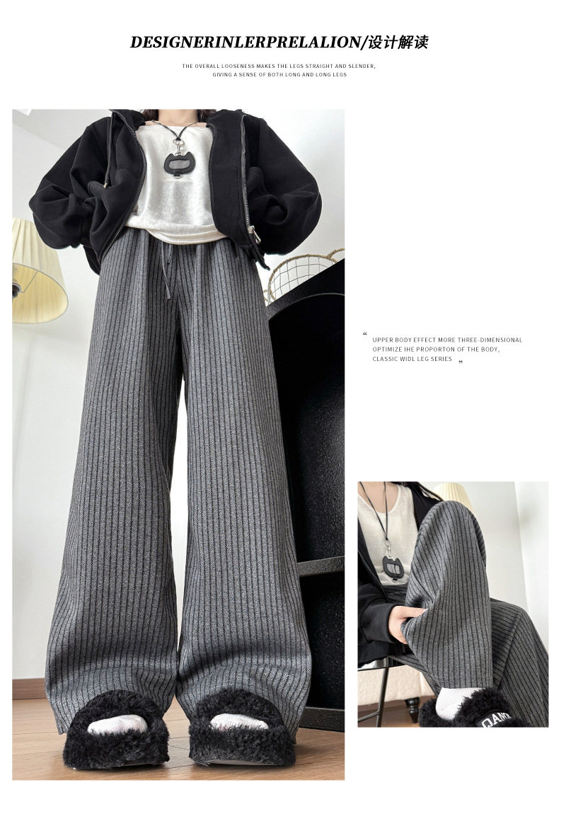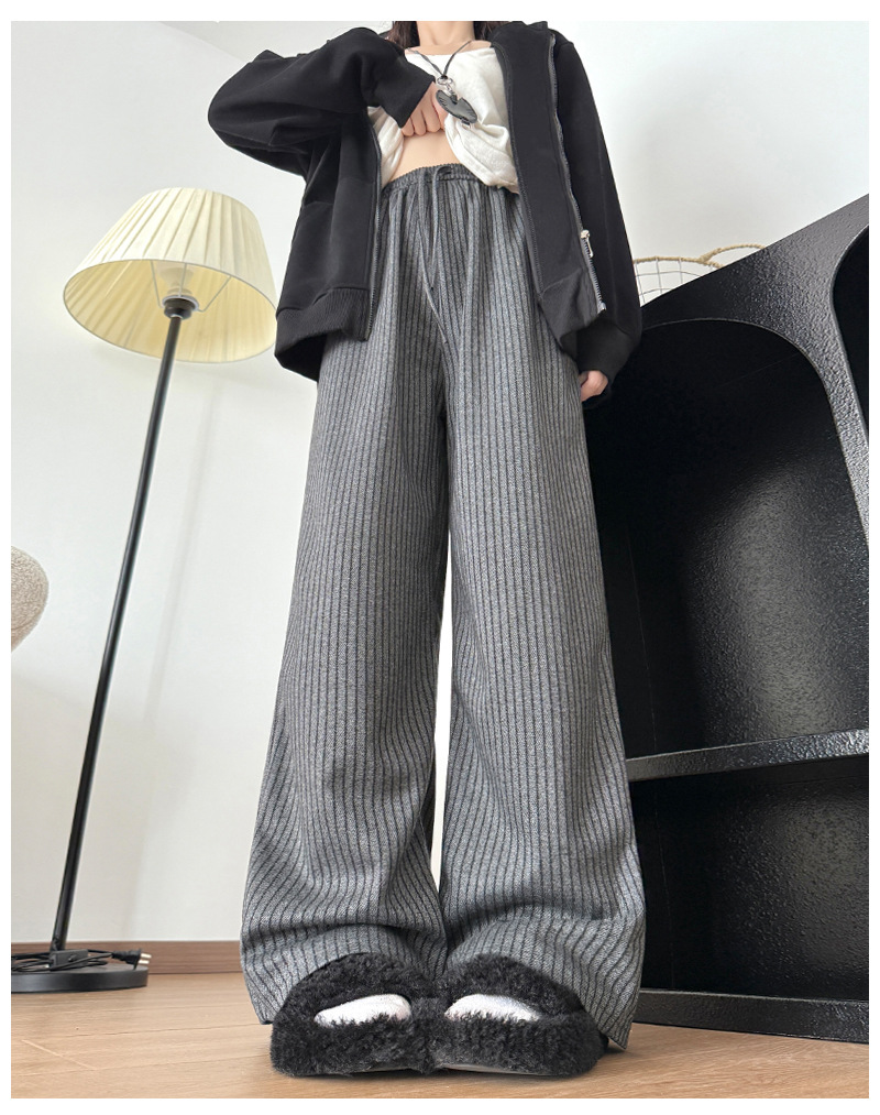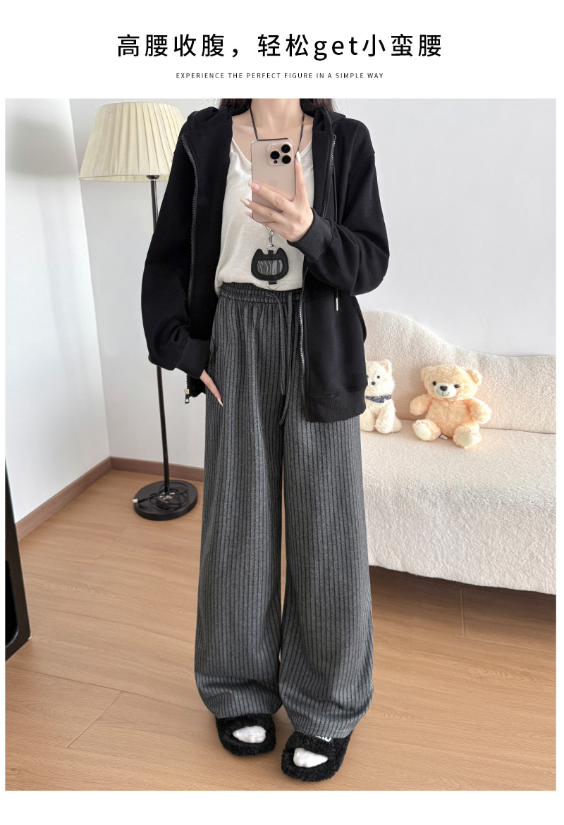 慵懒风摇粒绒条纹阔腿裤女秋冬宽松百搭高腰垂坠感显瘦休闲直筒裤