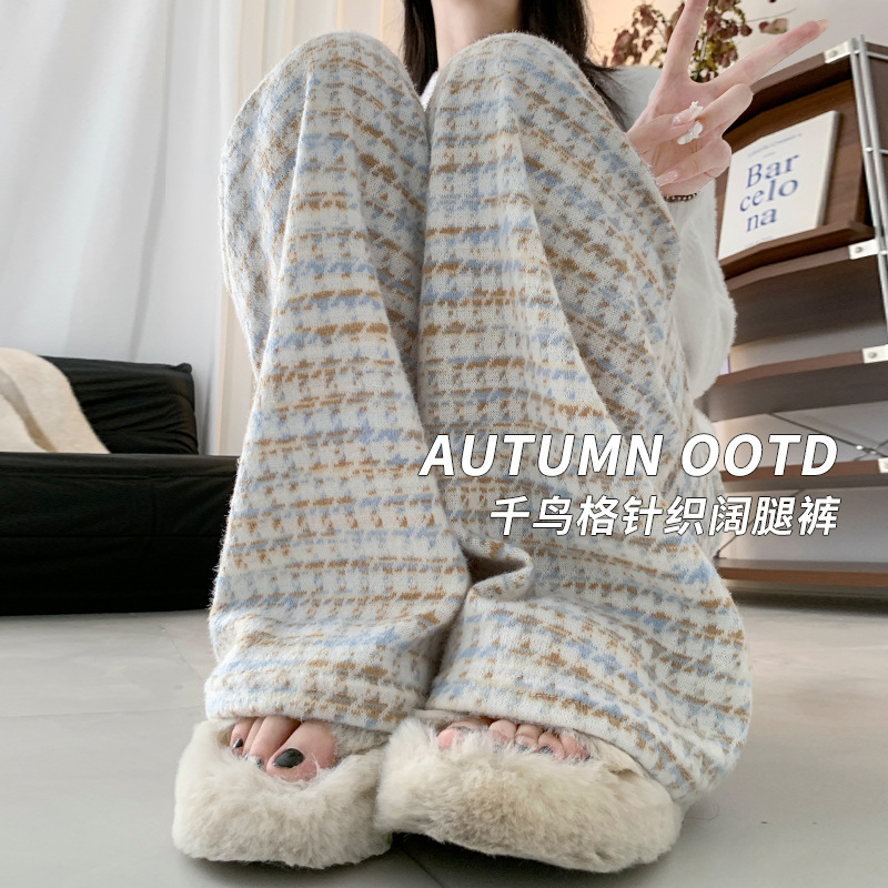 千鸟格阔腿裤女秋冬宽松高腰百搭垂感休闲遮肉显瘦直筒拖地针织裤