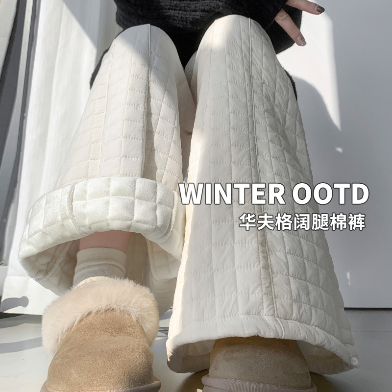 保暖防风绗缝格子阔腿裤女秋冬加绒加厚宽松两穿束脚显瘦休闲棉裤