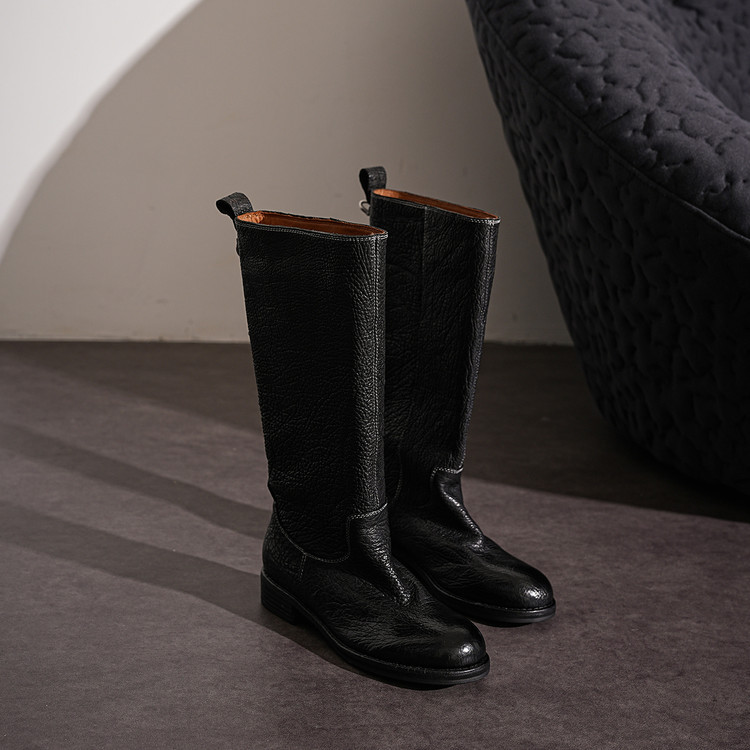 水洗马皮骑士靴女高筒长靴秋冬新款真皮圆头侧拉链粗中跟及膝靴女