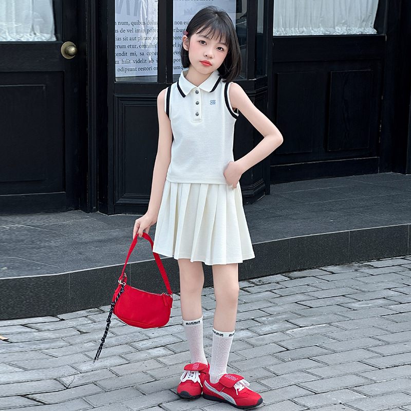 女の子カジュアルスカート 2025 夏新作ビッグ子供ファッショナブルなポロベストプリーツスカートスポーツ 2 点セット
