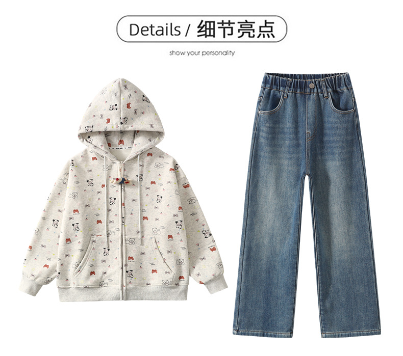 颜色 单件花灰色加绒外套,单件加绒牛仔裤